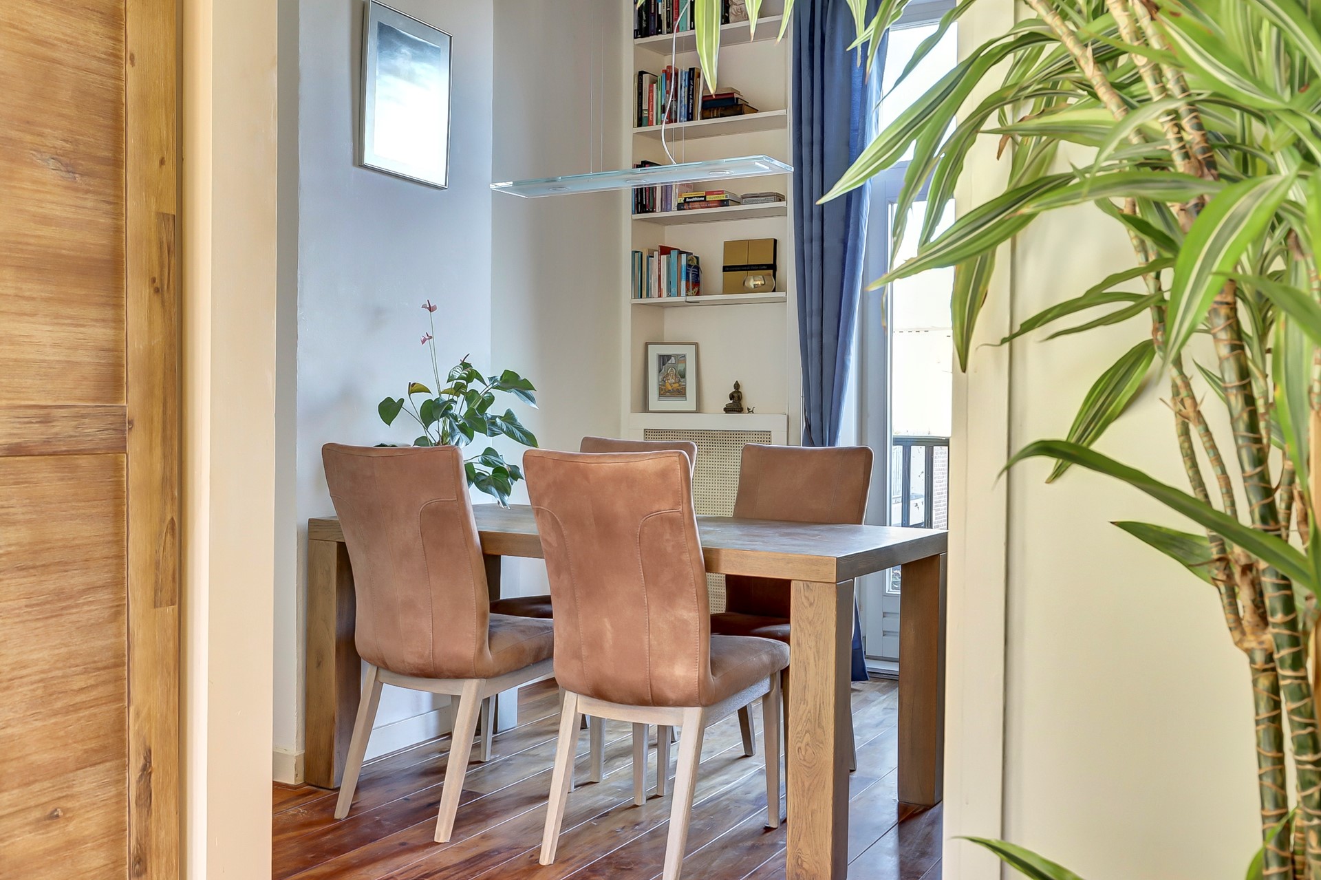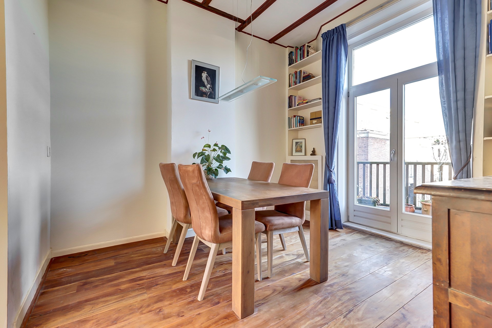 De woonkamer is licht en ruim dankzij de hoge ramen en het prettige daglicht. Aan de achterzijde bevinden zich de eetkamer en de keuken. Beide ruimtes hebben via openslaande deuren toegang tot het balkon. De moderne, gesloten keuken is voorzien van diverse inbouwapparatuur en beschikt over voldoende kastruimte.