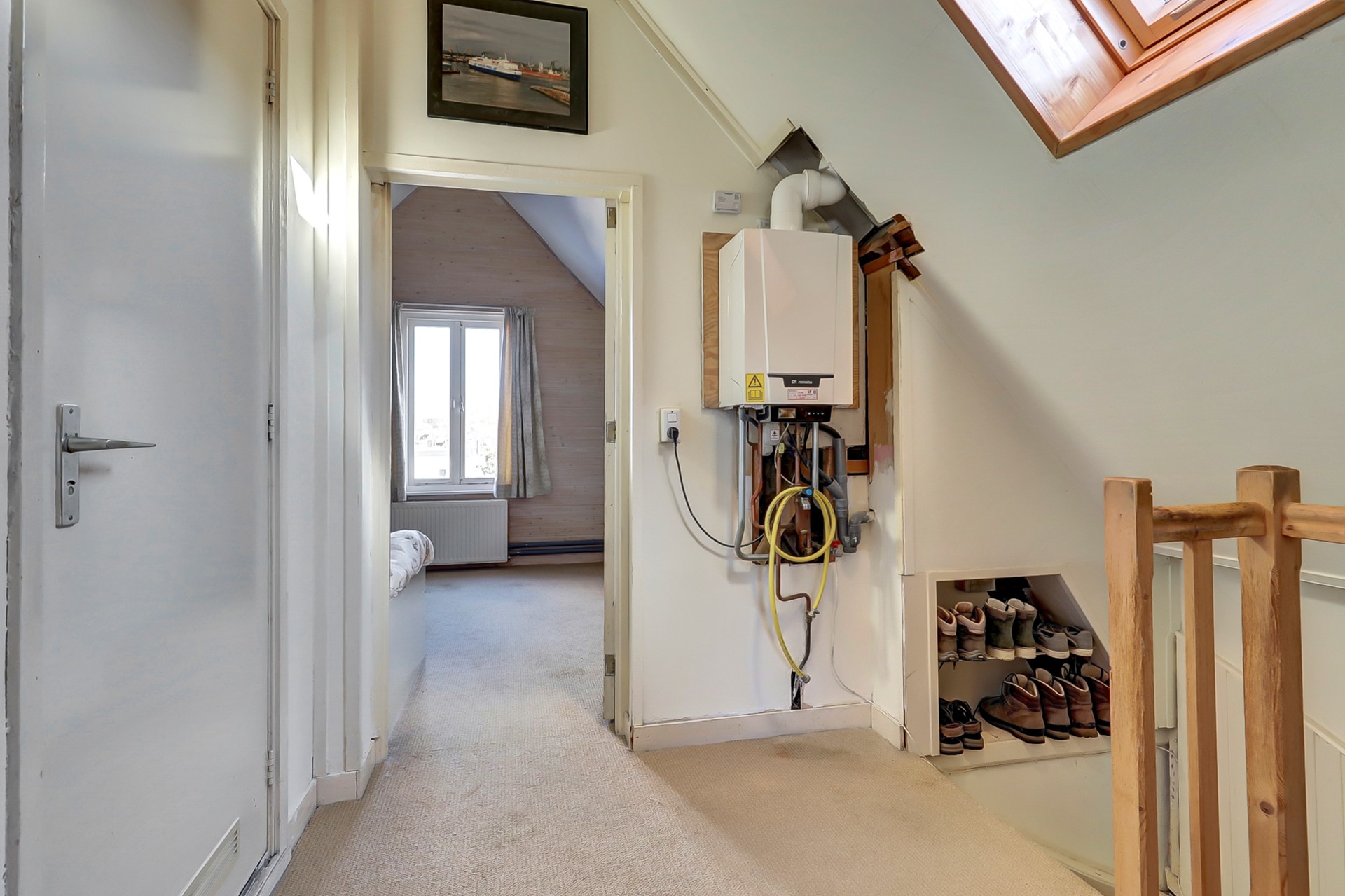 Overloop met dakraam, cv-installatie en toegang tot twee goed bemeten slaapkamers en de badkamer.