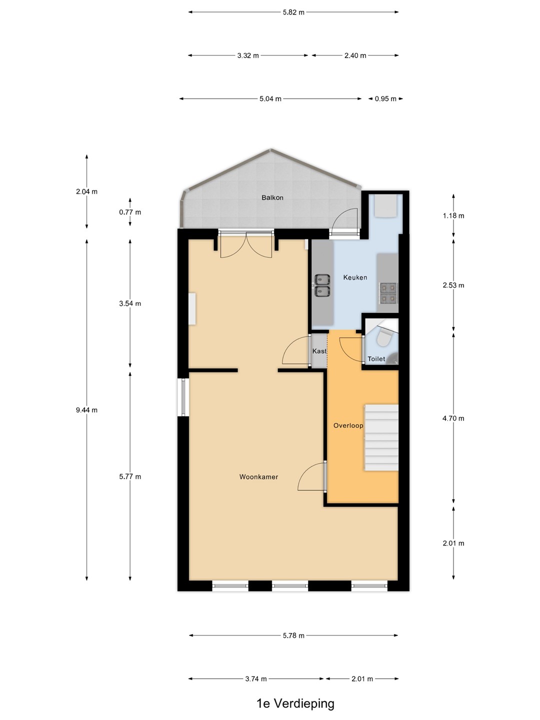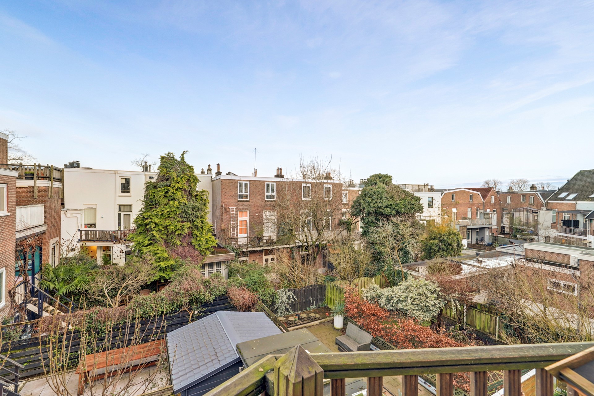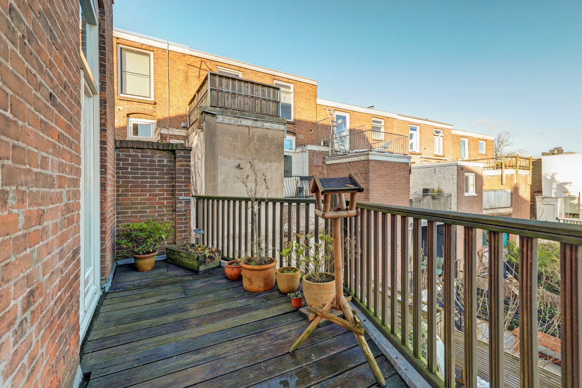 Het balkon is gelegen aan de achterzijde van de woning, op het oosten, en is toegankelijk vanuit zowel de eetkamer als de keuken. Een fijne plek om ’s ochtends van de zon te genieten.