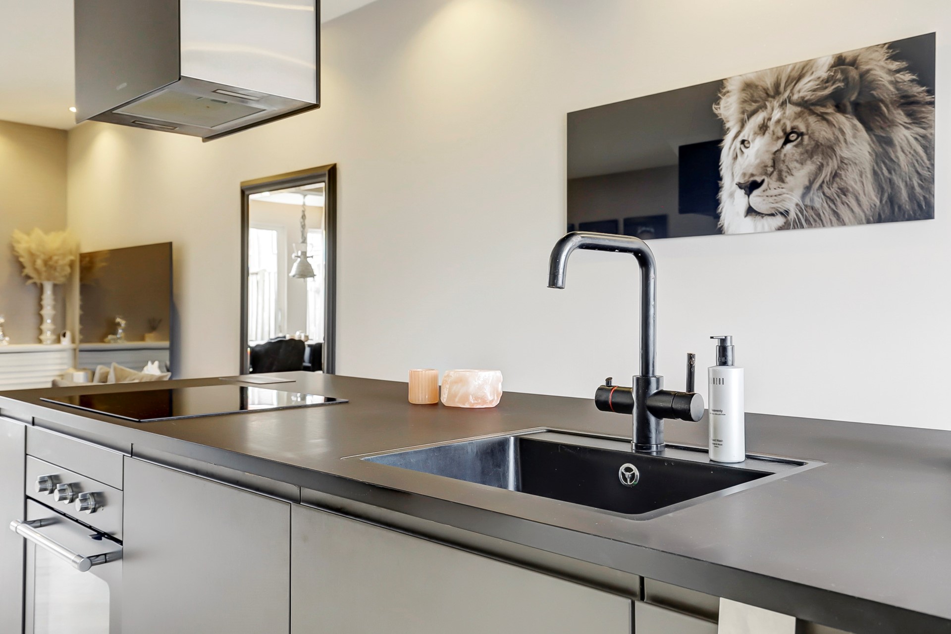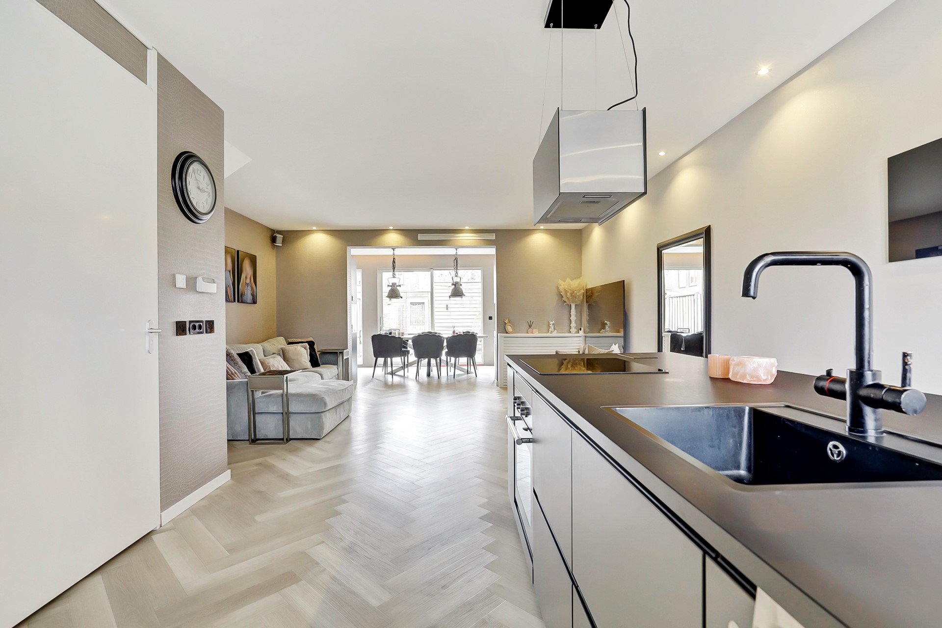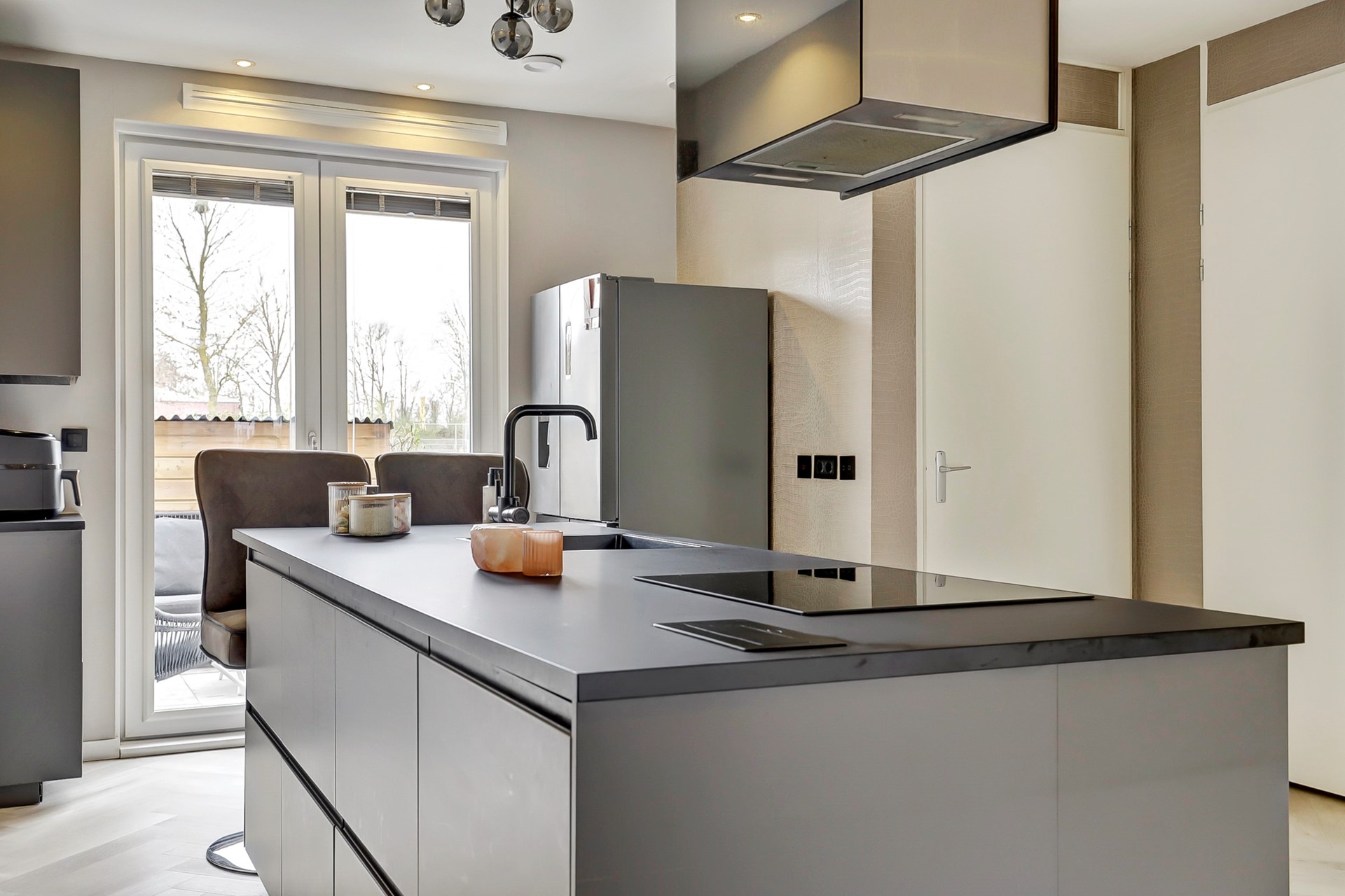 De moderne open keuken met eiland, gelegen aan de voorzijde van de woning, is voorzien van diverse inbouwapparatuur. Het eetgedeelte bevindt zich in de uitbouw aan de achterzijde en biedt een sfeervolle hoek met een koffiecorner en sfeerhaard. Dankzij de grote schuifpui geniet je hier van veel natuurlijk licht en heb je directe toegang tot de tuin.