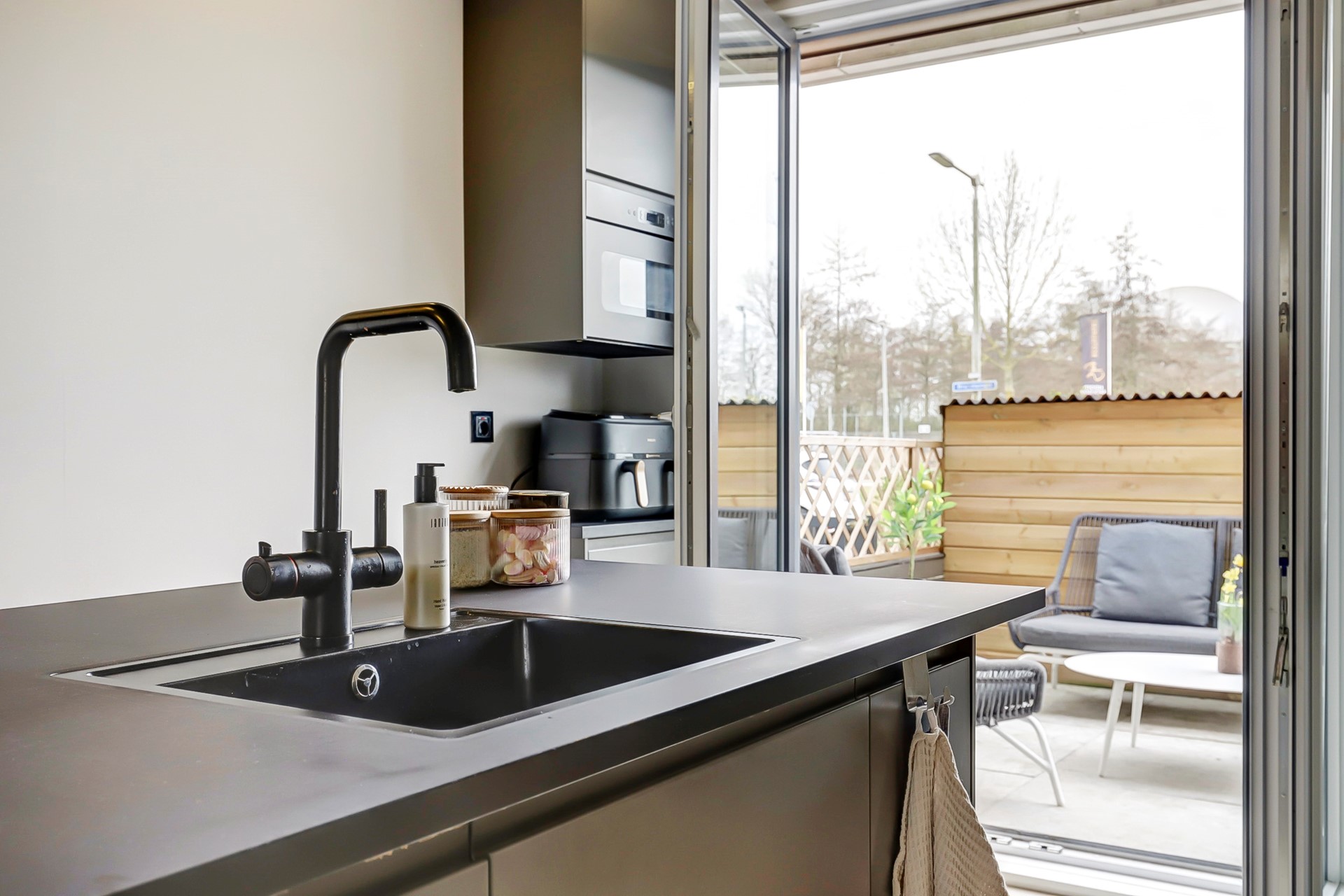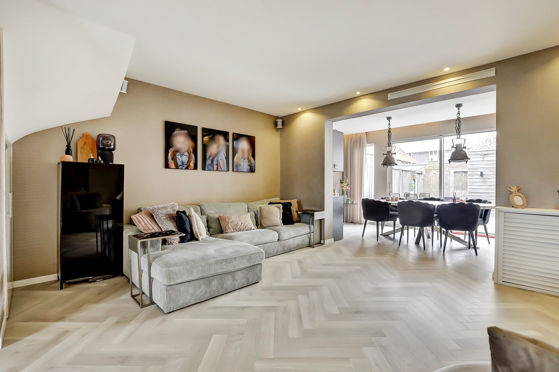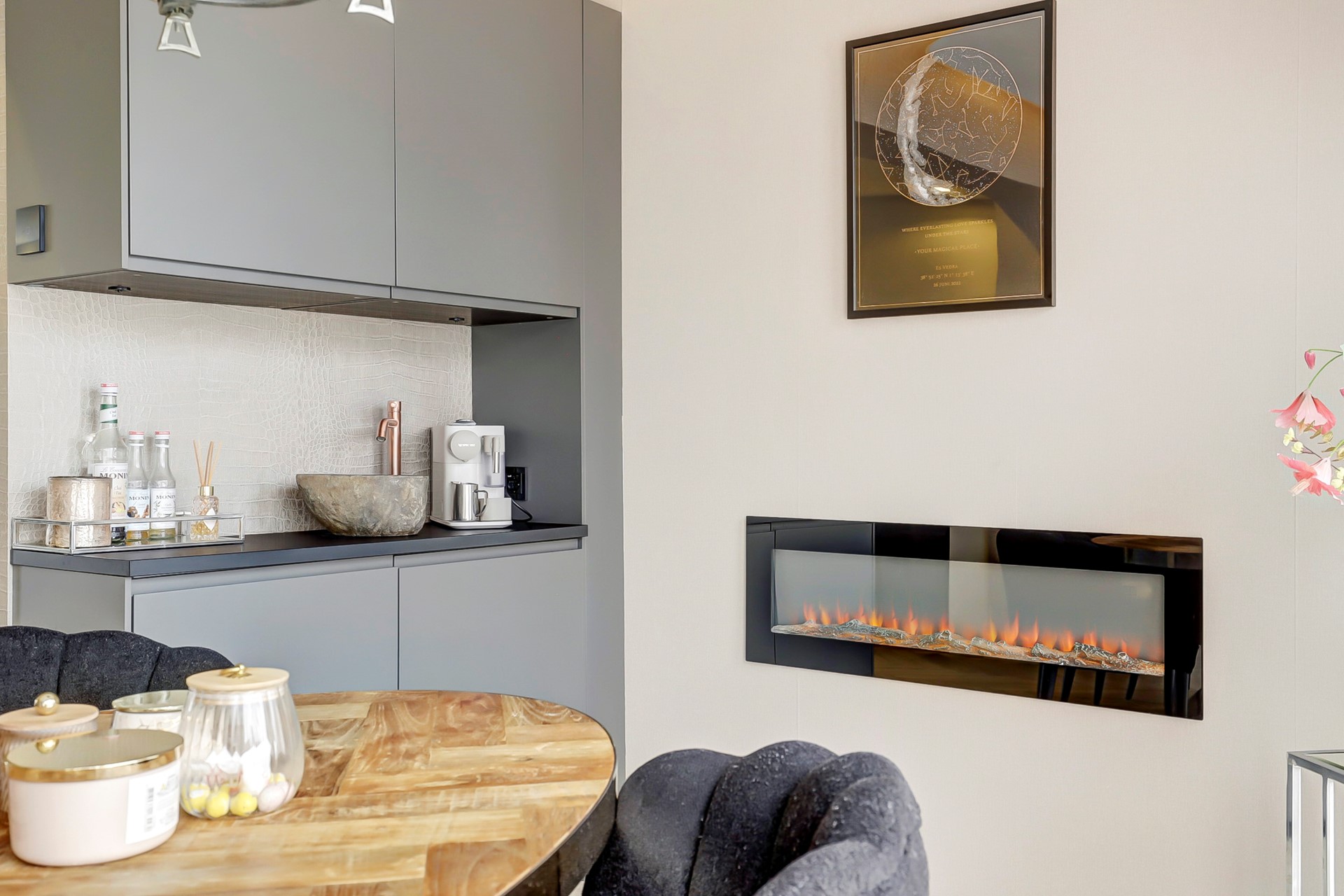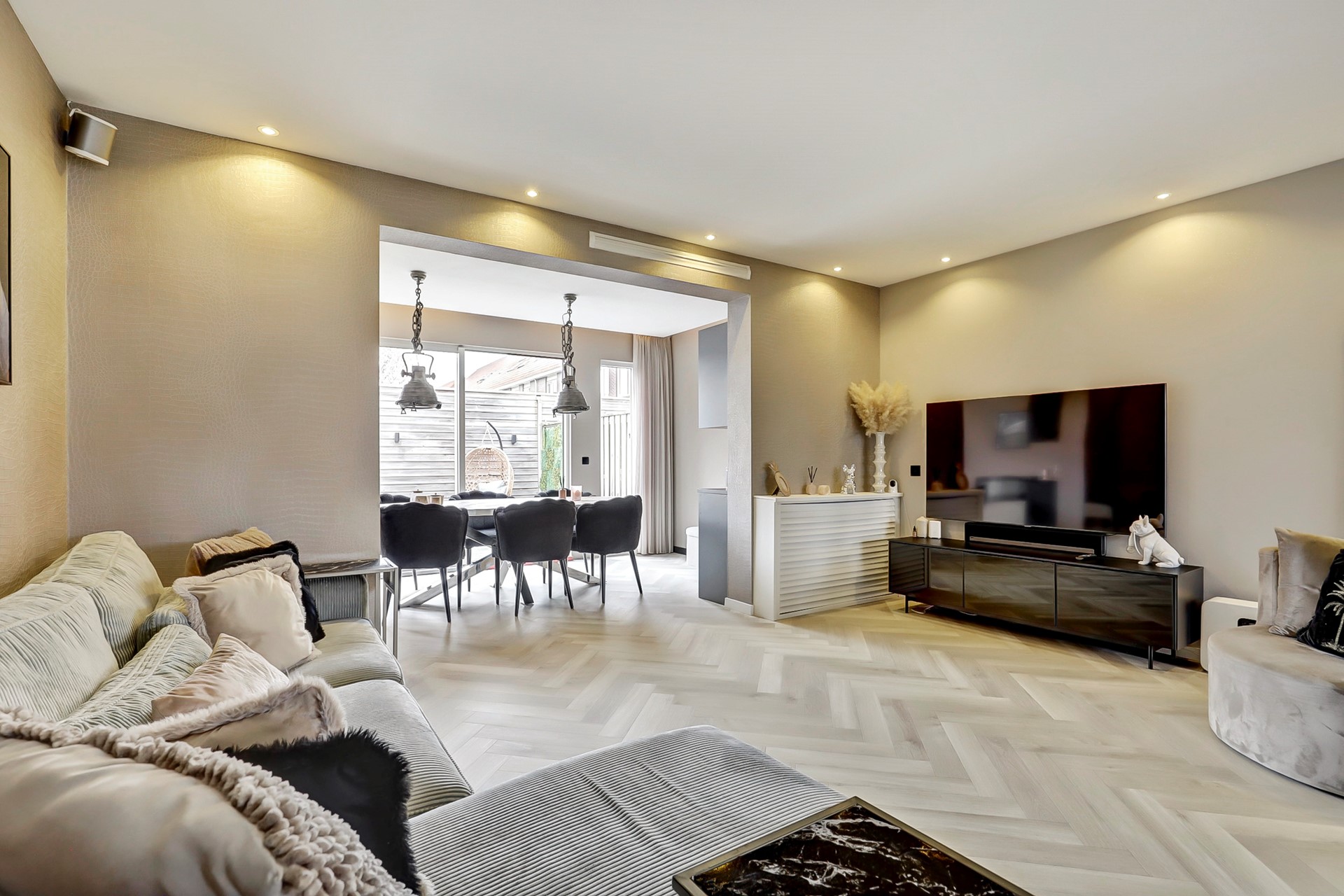 De moderne open keuken met eiland, gelegen aan de voorzijde van de woning, is voorzien van diverse inbouwapparatuur. Het eetgedeelte bevindt zich in de uitbouw aan de achterzijde en biedt een sfeervolle hoek met een koffiecorner en sfeerhaard. Dankzij de grote schuifpui geniet je hier van veel natuurlijk licht en heb je directe toegang tot de tuin.