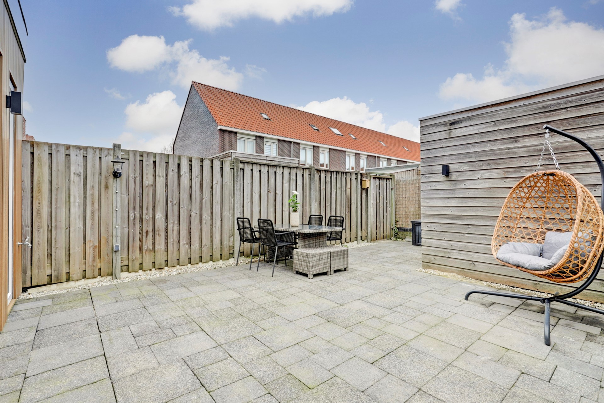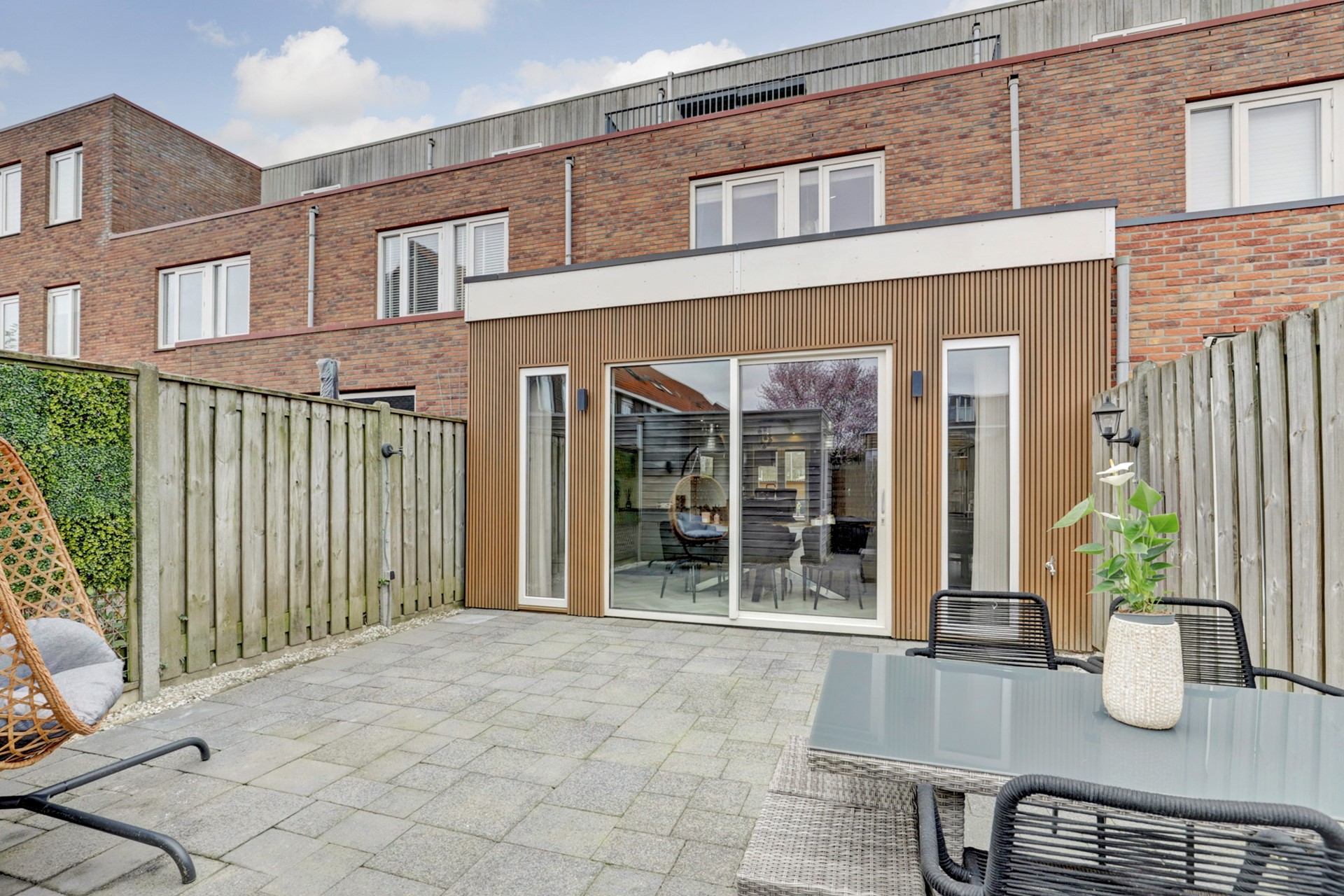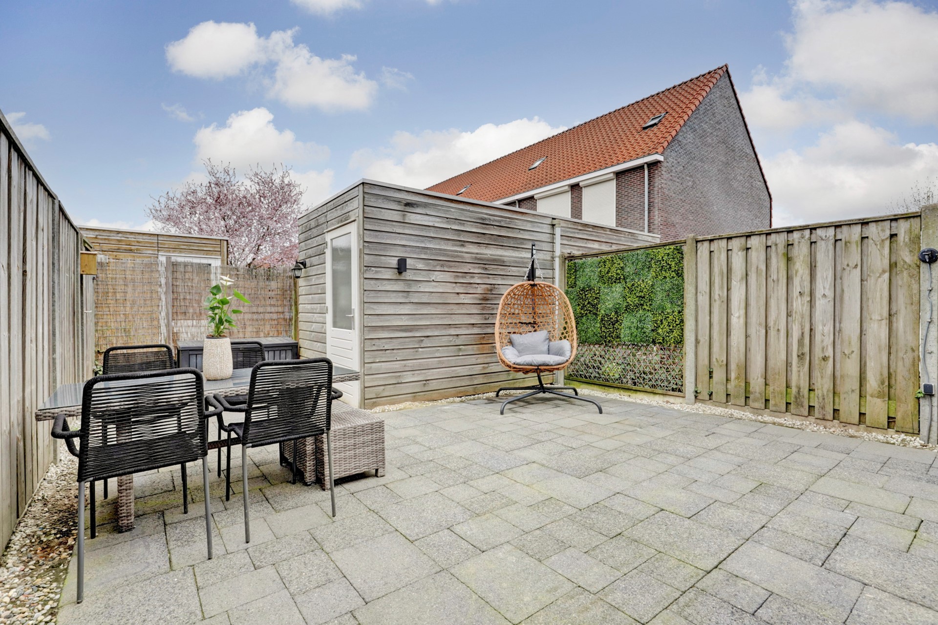 De achtertuin is een onderhoudsvriendelijke buitenruimte met een tegelvloer en een schutting rondom voor extra privacy. De berging biedt extra opslagruimte en dankzij de achterom is de tuin gemakkelijk toegankelijk.