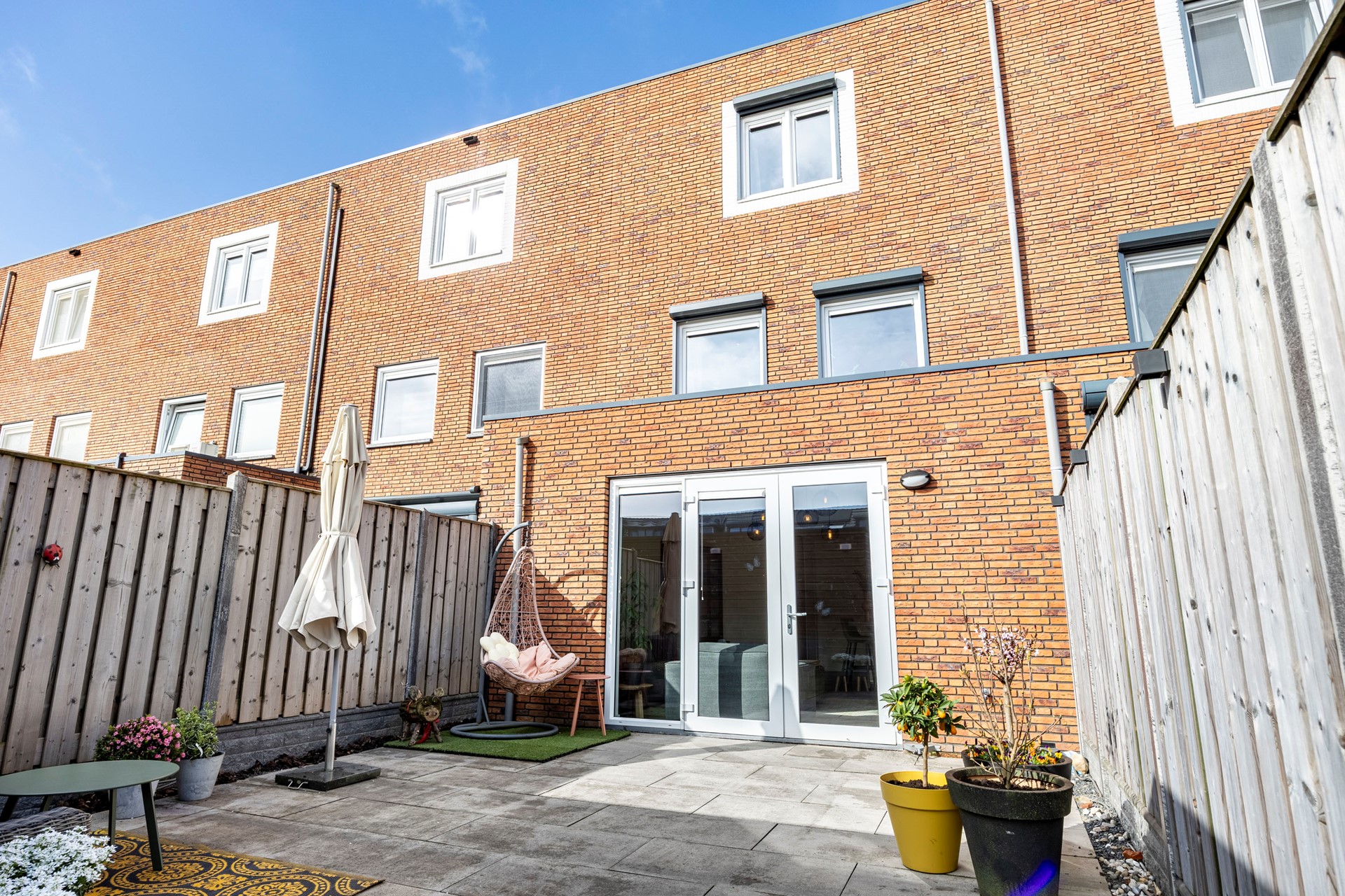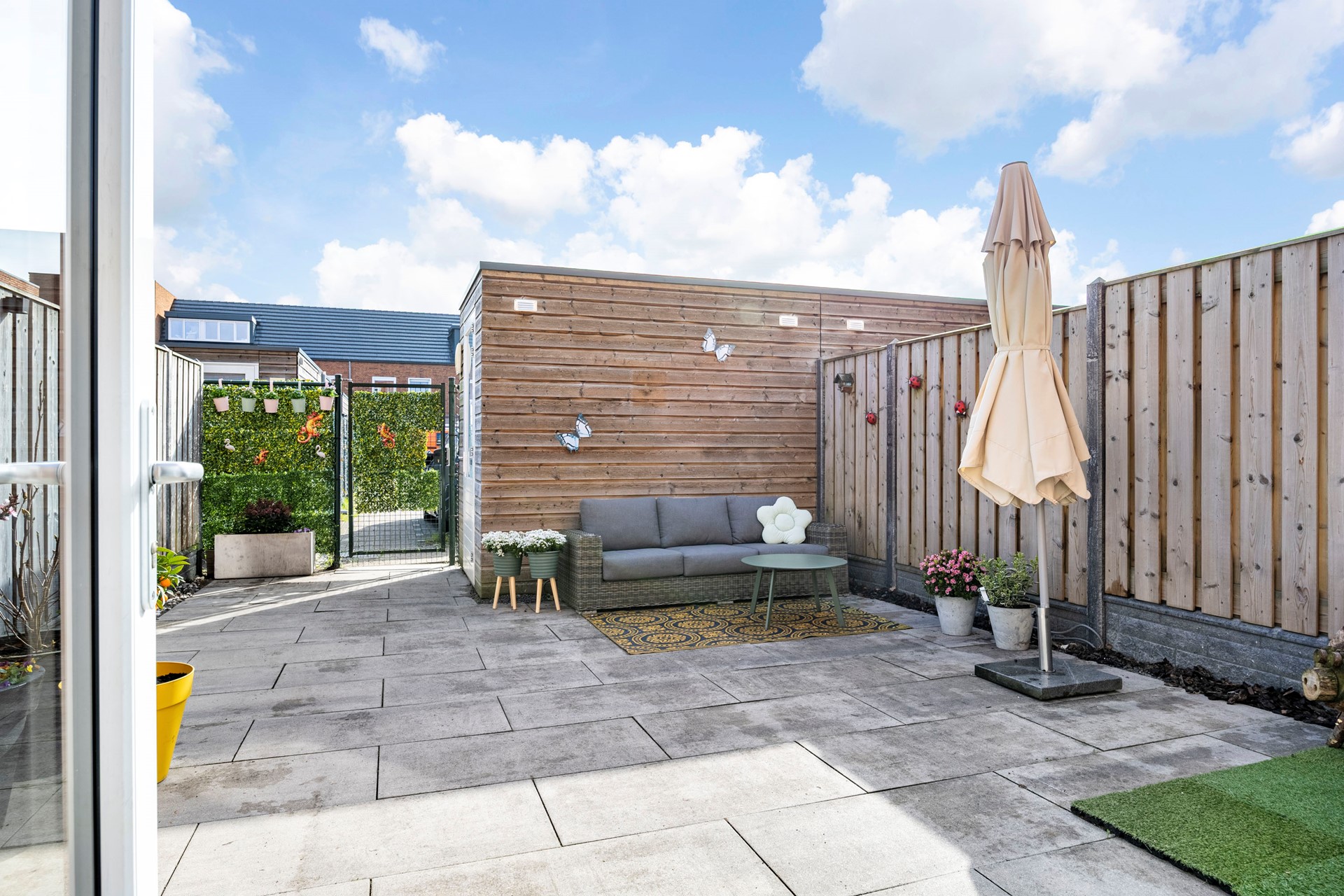 De onderhoudsvriendelijke achtertuin ligt op het zuidoosten en is voorzien van bestrating, houten schuttingen en een vrijstaande houten berging – ideaal voor fietsen of extra opslag. Een achterom biedt extra gemak.