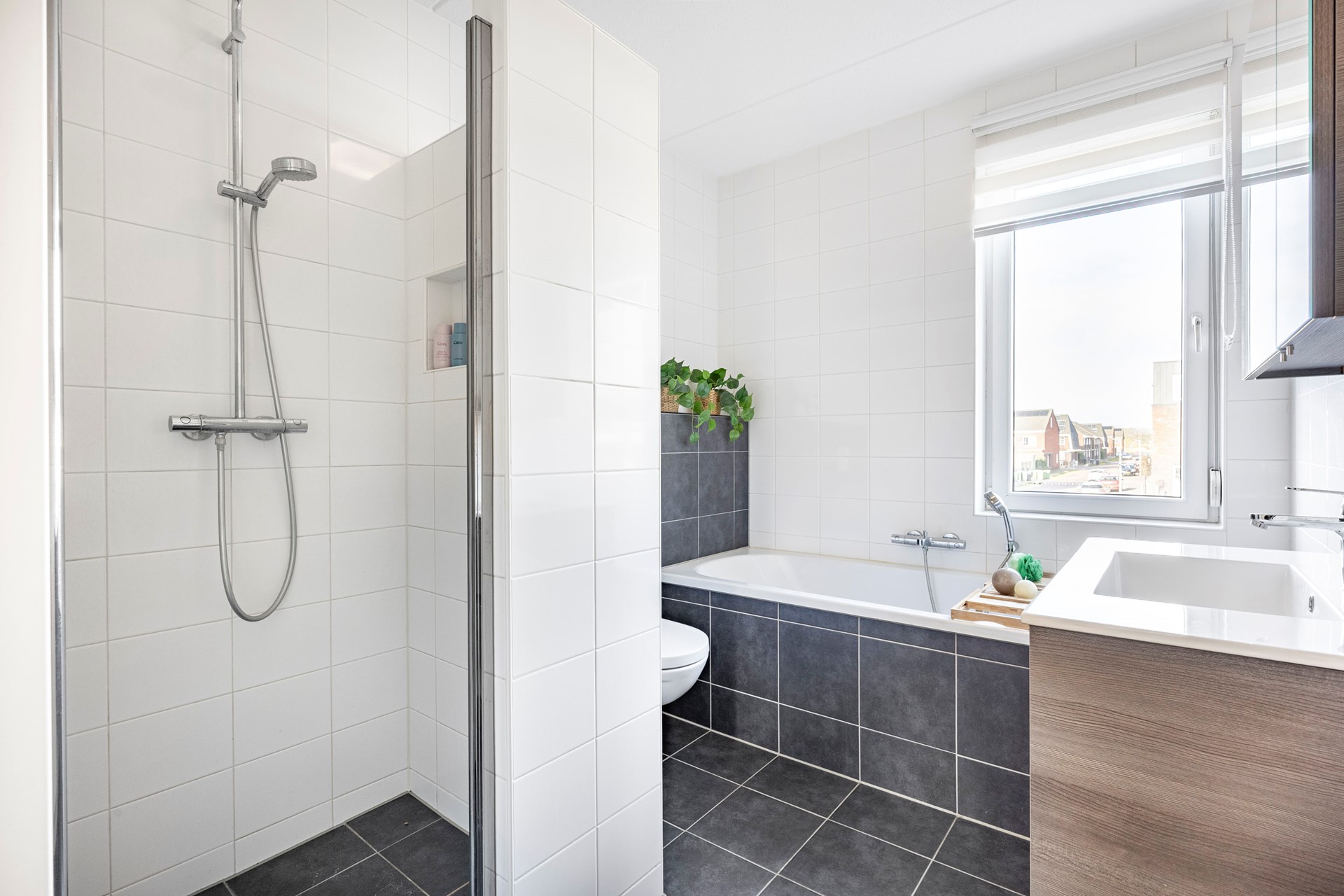 De overloop geeft toegang tot twee ruime slaapkamers, waarvan één met walk-in closet. De moderne badkamer is voorzien van een wastafelmeubel, douche, ligbad, toilet, designradiator en een raam voor extra daglicht.