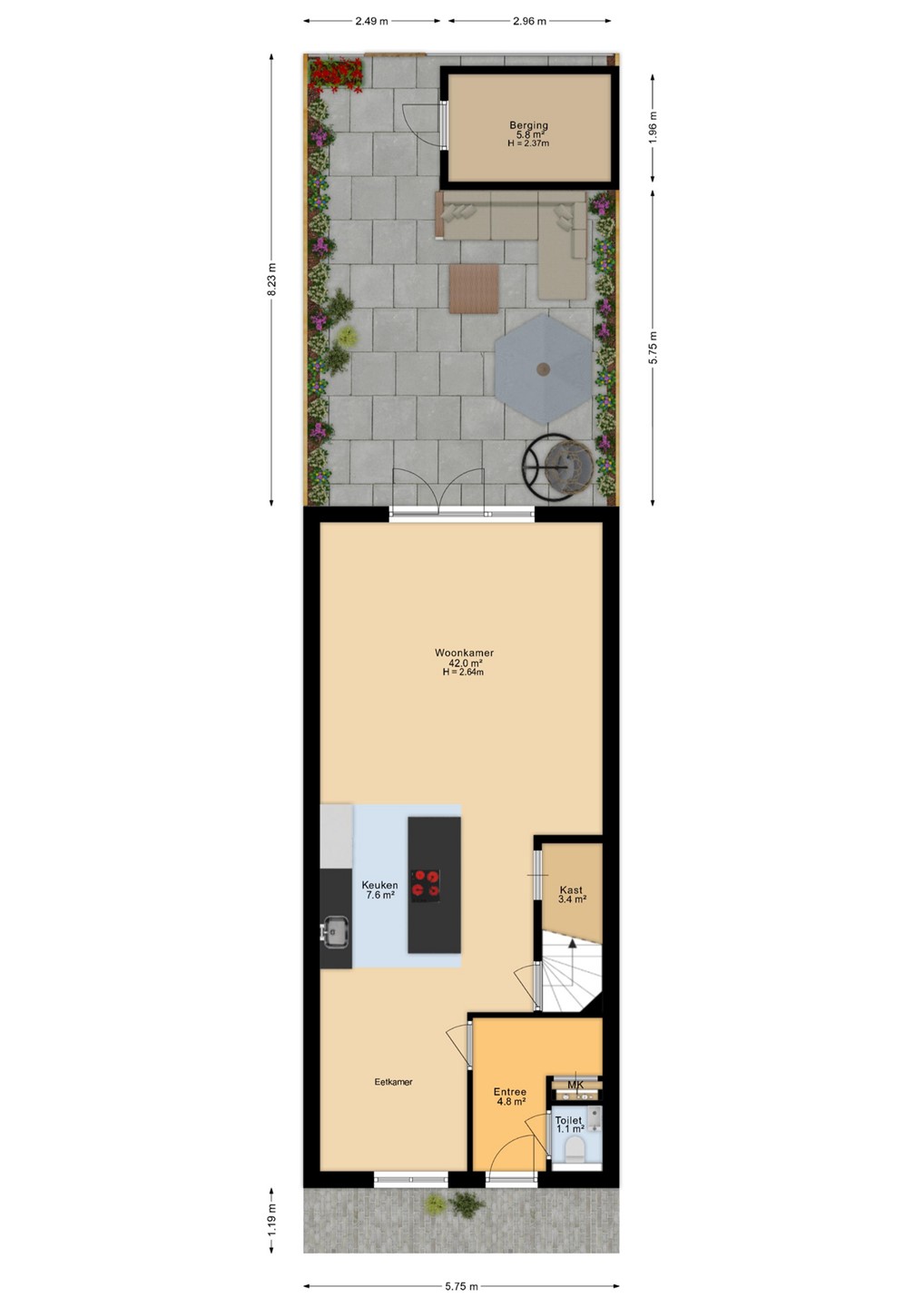 Hal met garderobe, meterkast en toilet. De woonkamer bevindt zich aan de achterzijde en is voorzien van een grote raampartij die veel natuurlijk licht binnenlaat. Openslaande deuren bieden een directe verbinding met de tuin, waardoor binnen en buiten naadloos in elkaar overlopen.