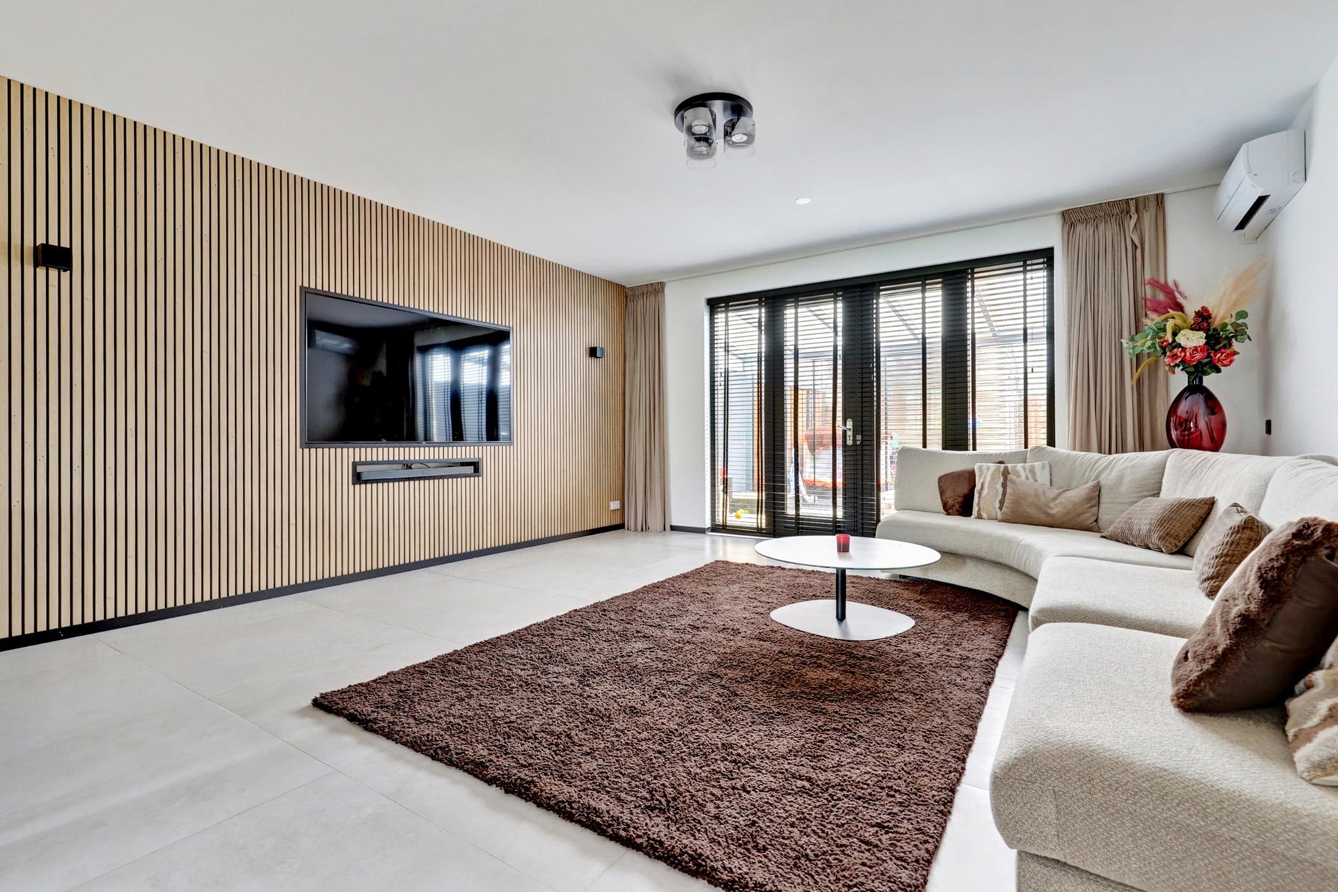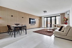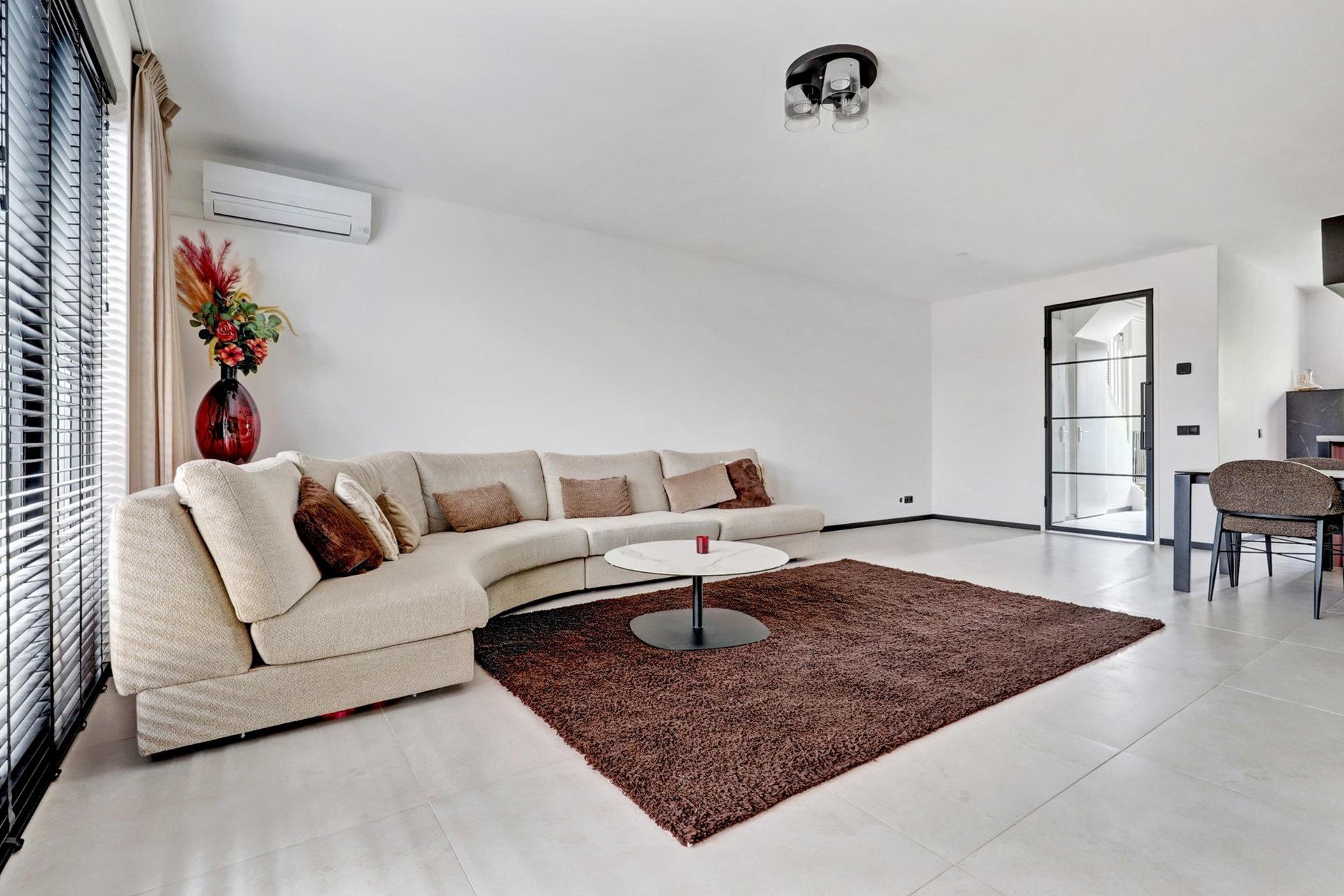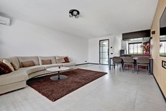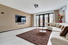 De woonkamer ligt aan de tuinzijde en geniet daardoor van veel privacy. De ruimte is voorzien van vloerverwarming en een lichte tegelvloer, wat zorgt voor optimaal comfort. Dankzij de grote raampartijen komt er veel natuurlijk licht binnen. Dubbele openslaande deuren bieden toegang tot de tuin en de serre, die volledig afsluitbaar is met glazen wanden, wat zorgt voor een lichte, aangename ruimte. Zowel de woonkamer als de serre zijn voorzien van airconditioning, waardoor het hele jaar door een aangenaam binnenklimaat gegarandeerd is.