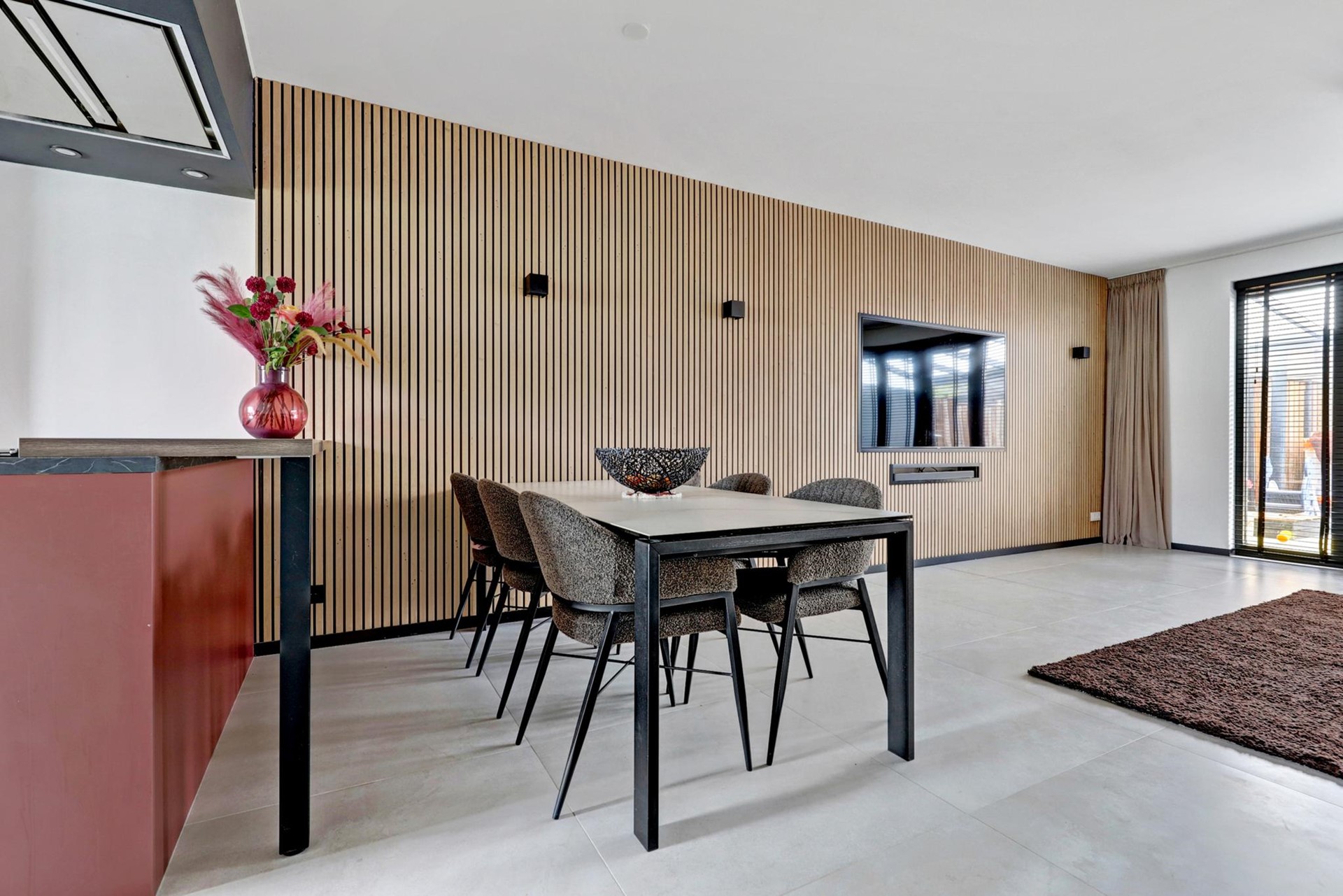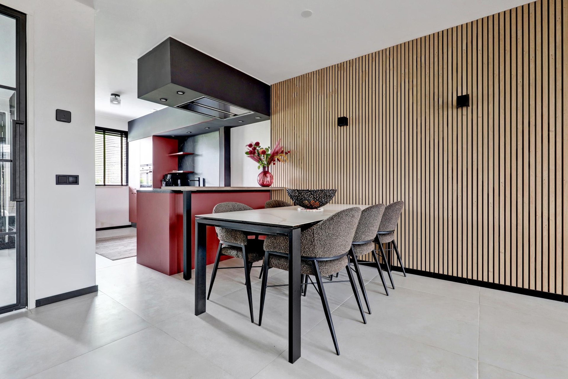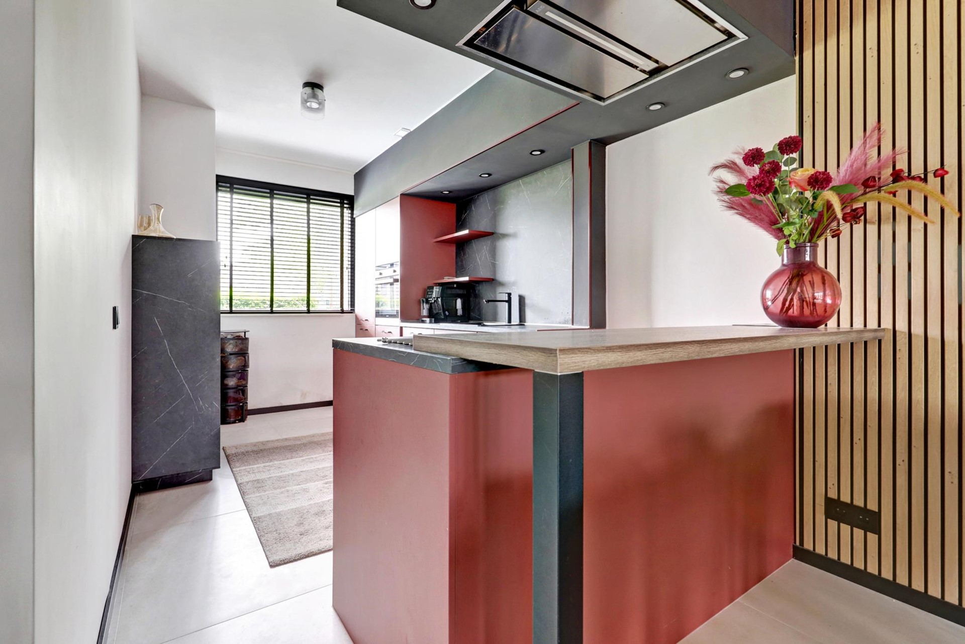 De moderne open keuken met schiereiland bevindt zich aan de voorzijde van de woning en is uitgerust met diverse inbouwapparatuur en voldoende opbergmogelijkheden. Het eetgedeelte vormt een natuurlijke overgang naar de keuken, wat bijdraagt aan een open en gezellige sfeer.