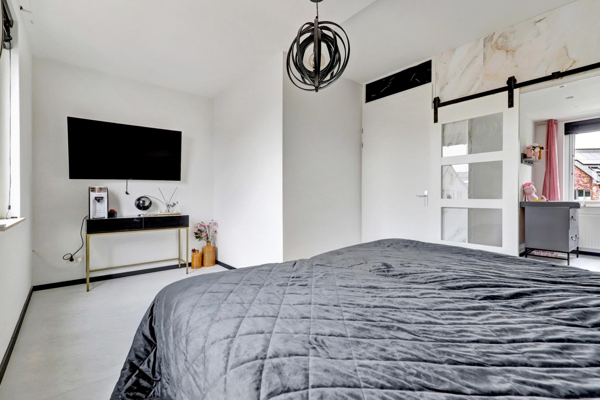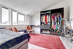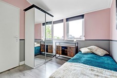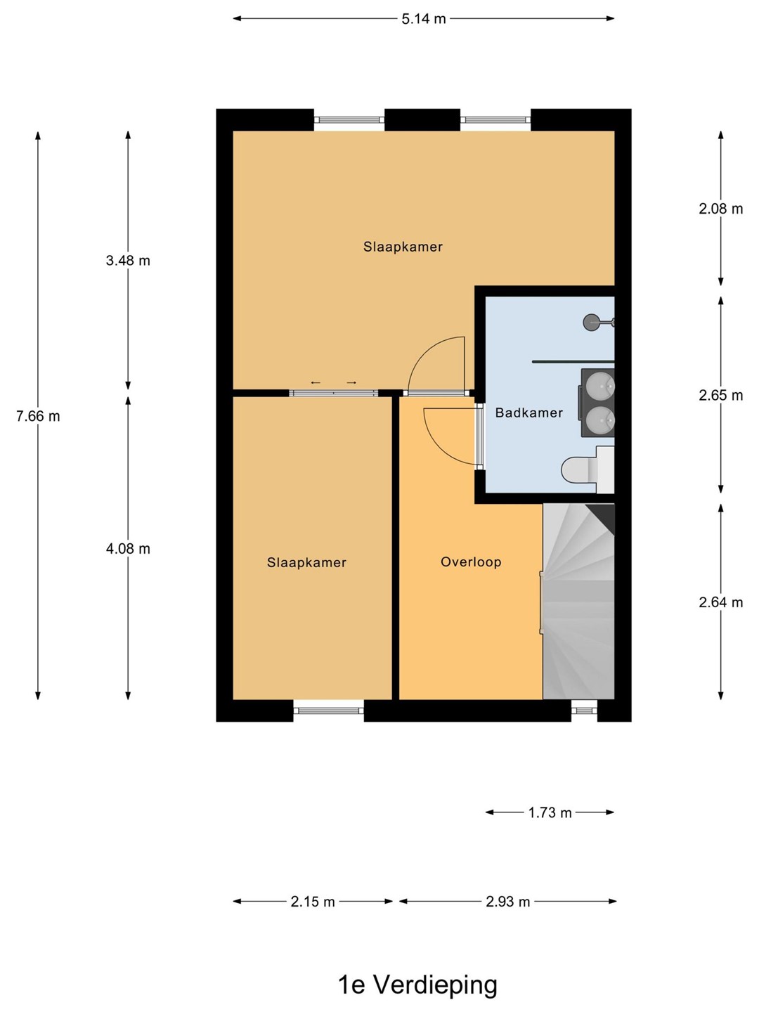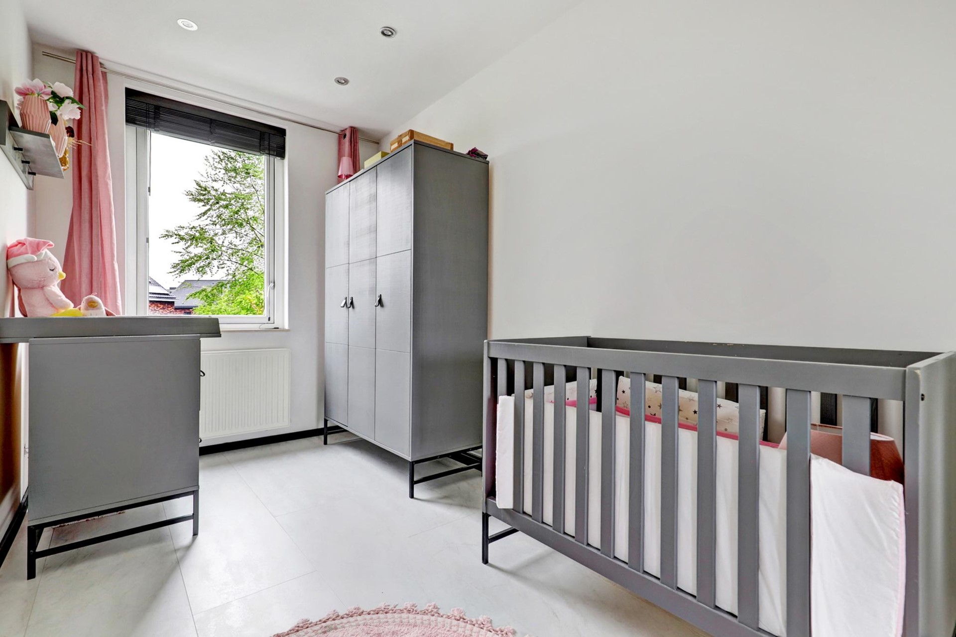 Via een vaste trap bereik je de tweede verdieping, die is uitgerust met een lichte laminaatvloer. Deze verdieping biedt twee ruime slaapkamers, beide met grote raampartijen en openslaande ramen, waardoor er veel natuurlijk licht binnenkomt. De overloop is licht en goed te ventileren door het openslaande raam en biedt bovendien voldoende ruimte voor witgoedapparatuur.