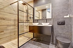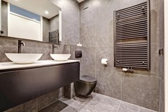 Op de eerste verdieping bevinden zich twee ruime slaapkamers, voorzien van een nieuwe laminaatvloer, en een moderne luxe badkamer. De badkamer is uitgerust met een inloopdouche, een dubbel wastafelmeubel en een toilet.