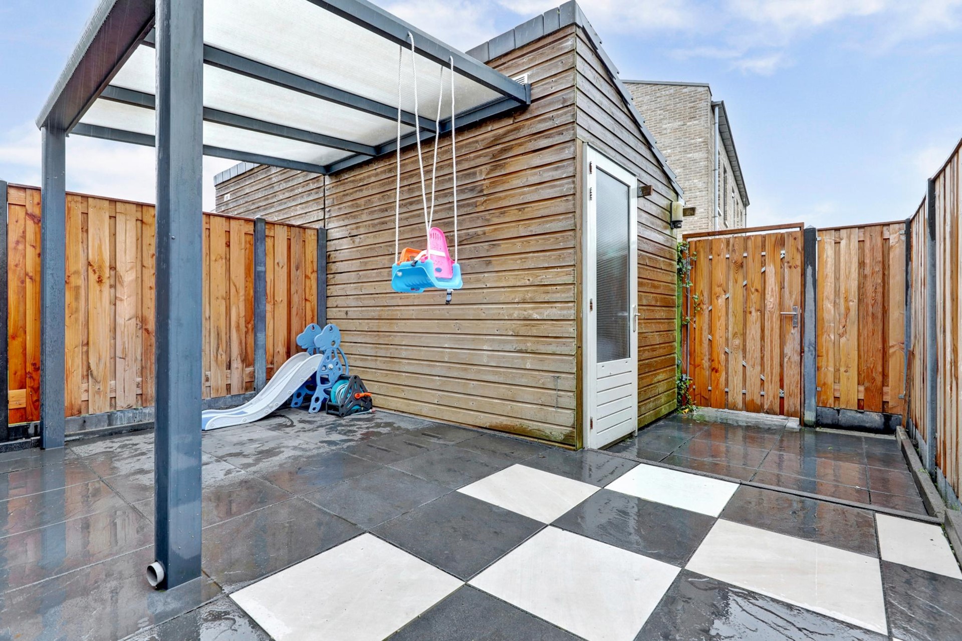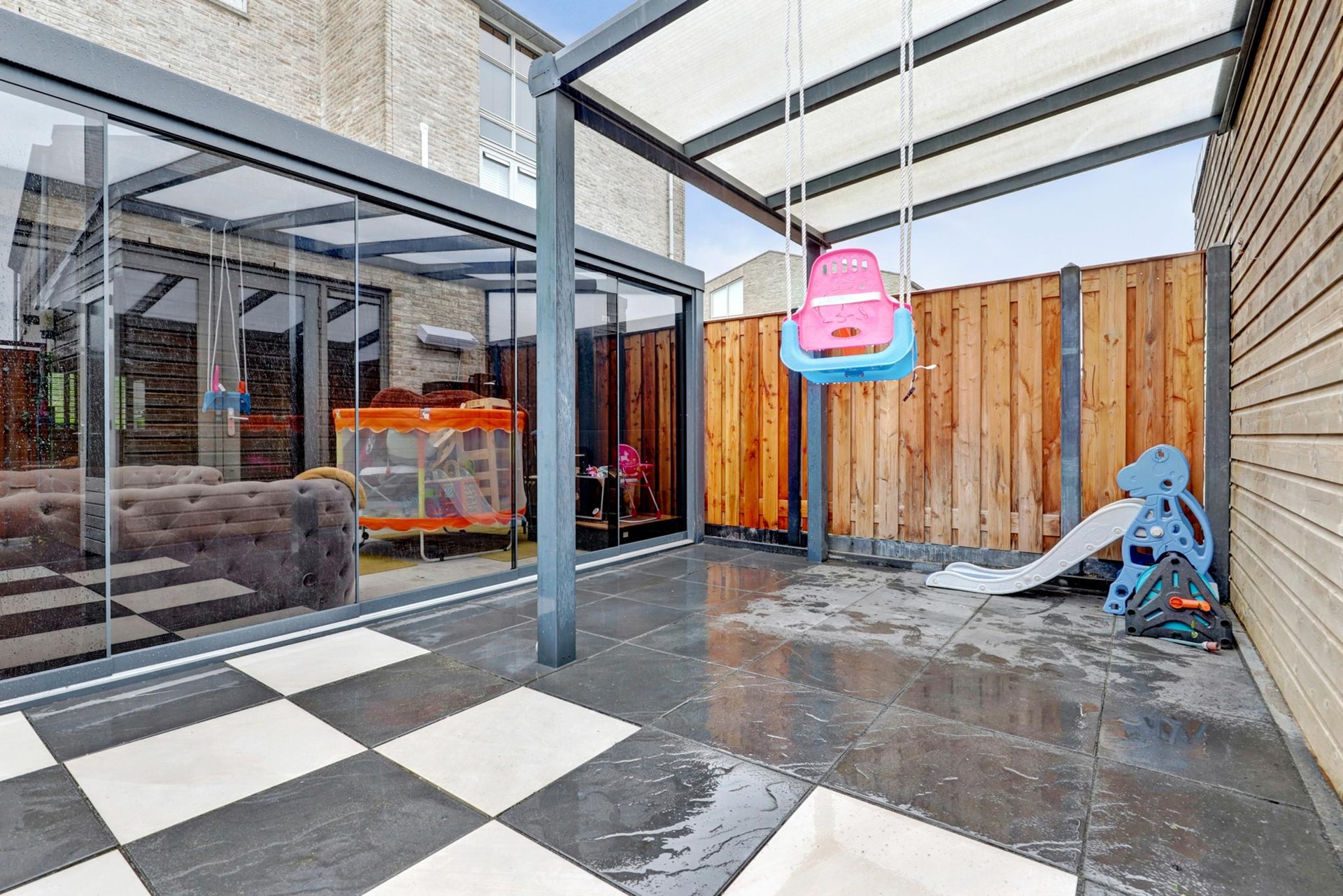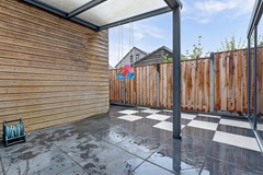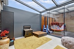 Deze onderhoudsvriendelijke achtertuin ligt op het westen en biedt een heerlijke plek om te ontspannen. Achterin de tuin bevindt zich een berging welke is verbonden met een overkapping. De serre, die aan de woning vastzit, is voorzien van glazen schuifdeuren en is uitgerust met een moderne tegelvloer en airconditioning, wat het mogelijk maakt om het hele jaar door comfortabel buiten te zitten. De tuin is eenvoudig bereikbaar via een achterom, volledig betegeld en heeft houten schuttingen, wat bijdraagt aan de privacy en het onderhoudsgemak.