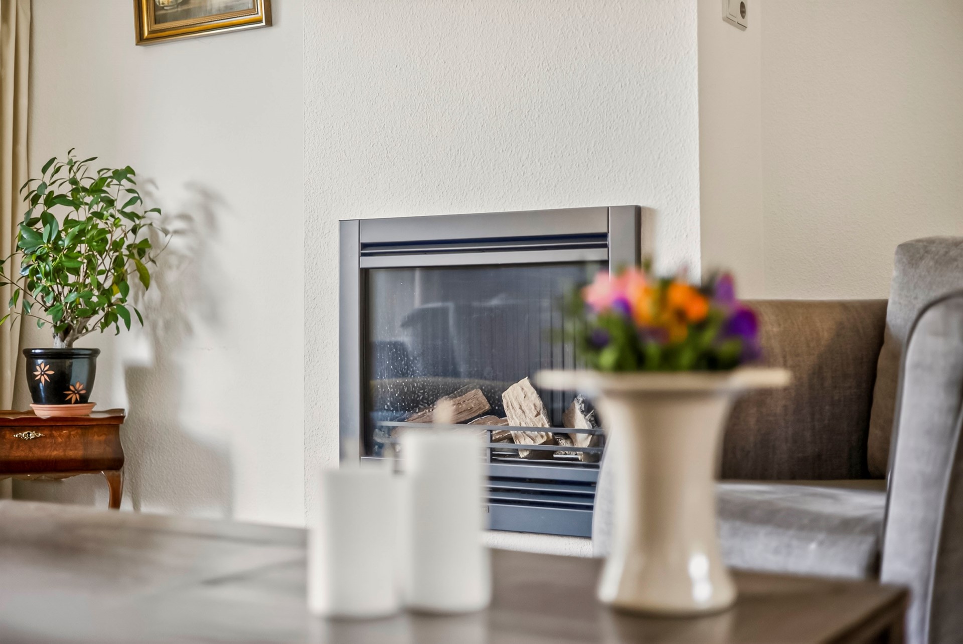 De woonkamer aan de voorzijde is voorzien van een sfeervolle gashaard en kenmerkt zich door een prettige lichtinval en uitzicht op de verzorgde voortuin. Aan de achterzijde bevinden zich de eetkamer en de keuken. Vanuit de eetkamer geven openslaande deuren toegang tot de achtertuin, wat zorgt voor een fijne verbinding tussen binnen en buiten.