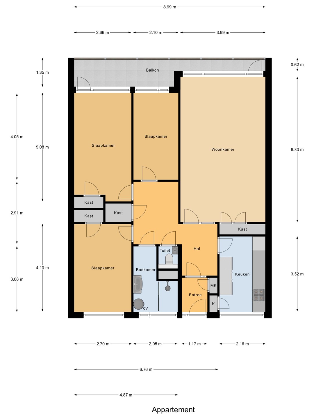 Je stapt binnen in een ruime hal met garderobe, meterkast en toilet. Vanuit deze centrale hal heb je toegang tot alle vertrekken van het appartement. De woonkamer is licht en ruim, met grote ramen die voor veel daglicht zorgen en een prettig vrij uitzicht bieden. Vanuit de woonkamer loop je zo het zonnige balkon op, dat op het zuidwesten ligt. De moderne dichte keuken is voorzien van inbouwapparatuur en biedt voldoende opbergruimte. Het appartement heeft drie slaapkamers, waarvan twee met vaste kasten en één met directe toegang tot het balkon. De badkamer (2019) is modern en functioneel ingericht met een wastafelmeubel, inloopdouche en de opstelling van de boiler.