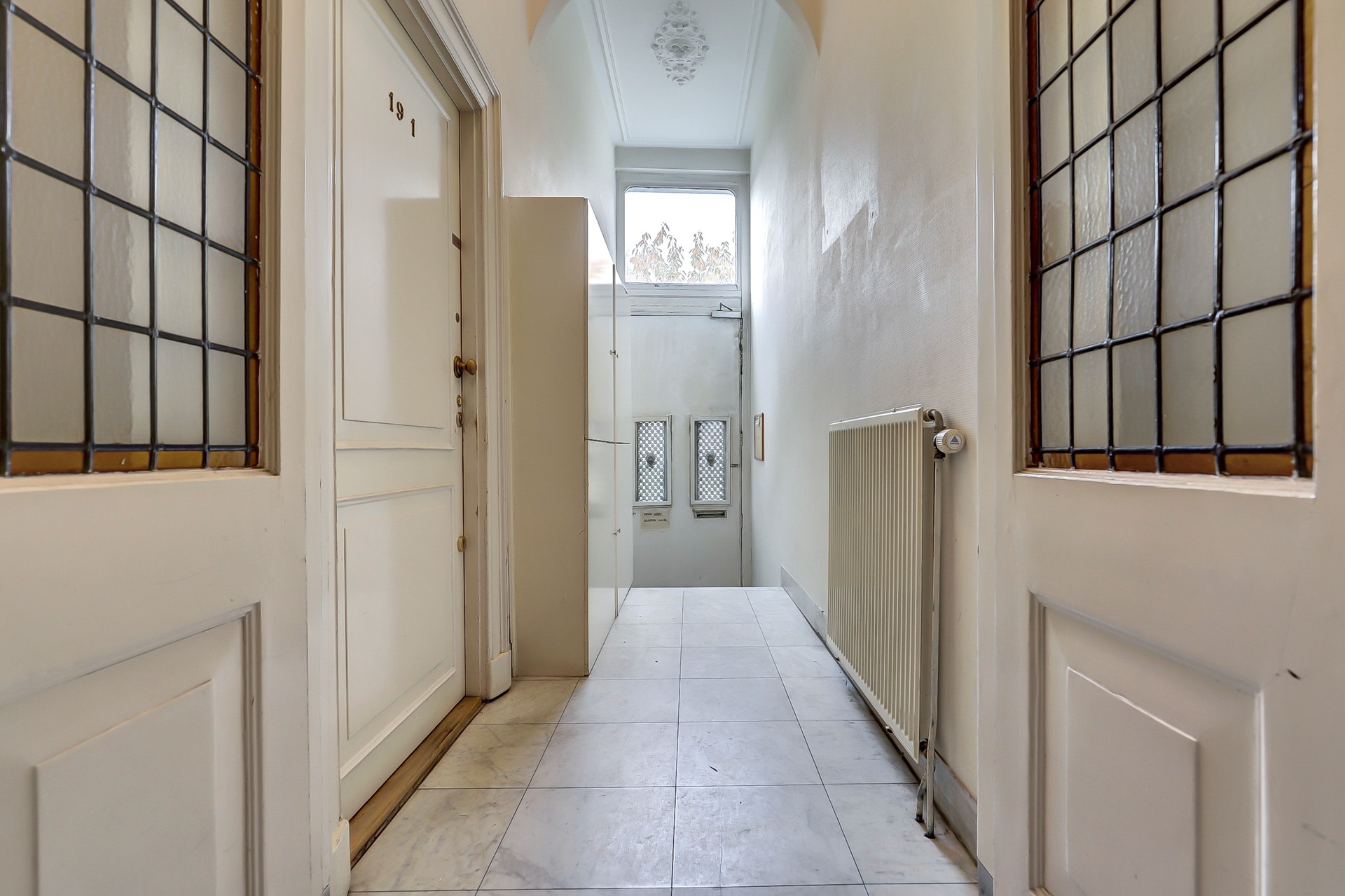 Gezamenlijke entree met karakteristieke details, waaronder de originele marmeren vloer. Vanuit de hal is er toegang tot de trapopgang naar de tweede verdieping en tot de eigen berging in het souterrain.