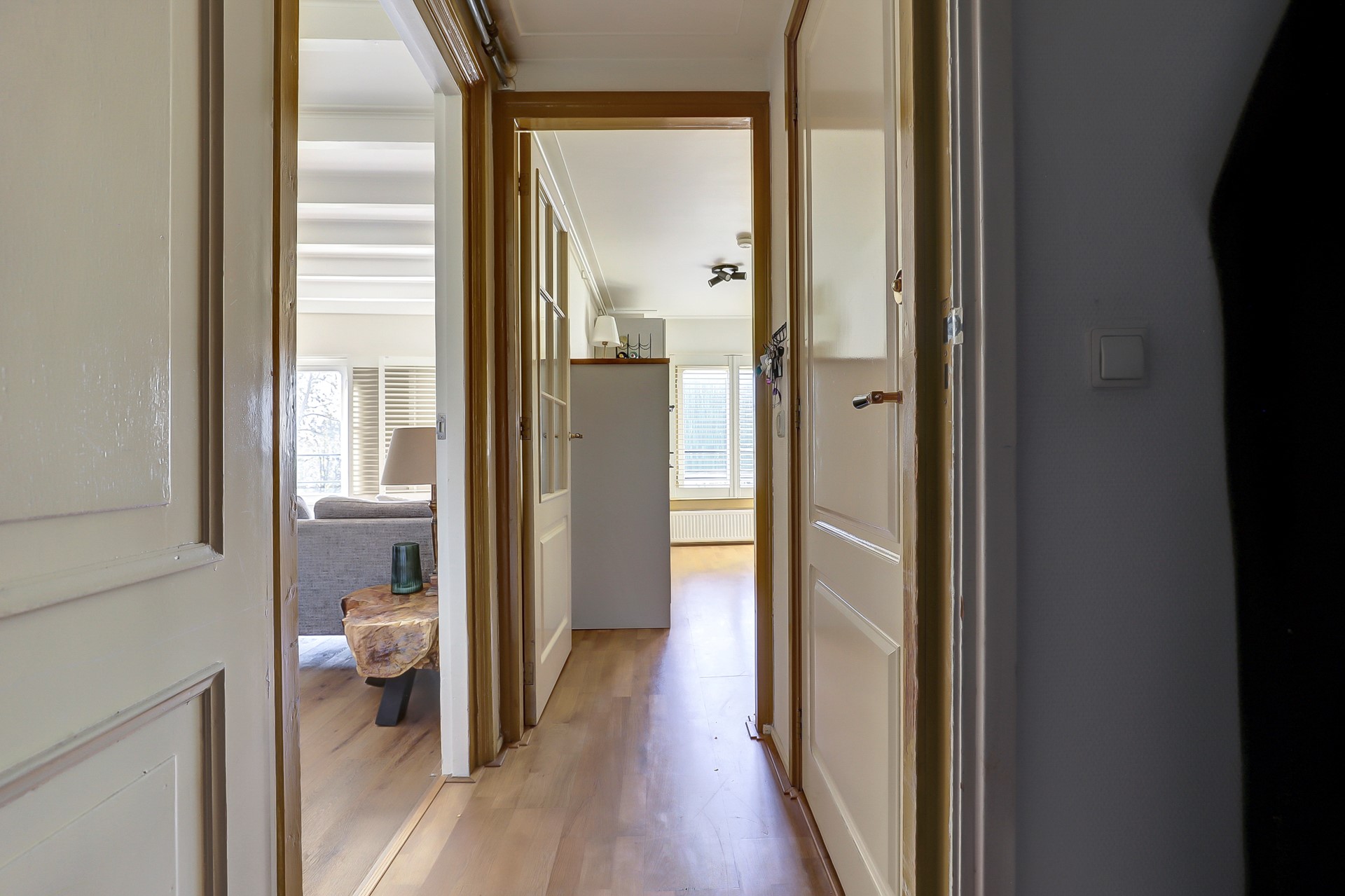 Entree, hal en toilet. De woonkamer is voorzien van een nieuwe PVC-vloer (2023) en sfeervolle shutters aan de voorzijde. Dankzij de hoge ligging geniet je hier van een prachtig uitzicht over het Musispark en de Parkzaal van Musis Sacrum.