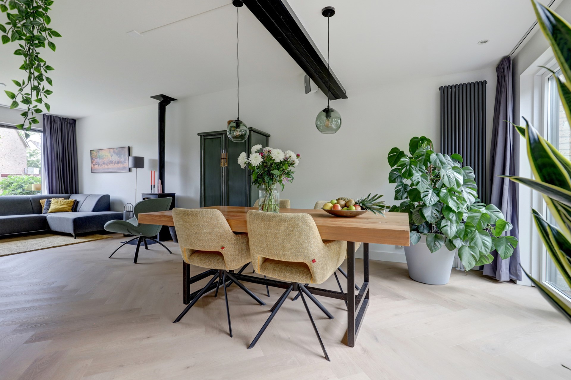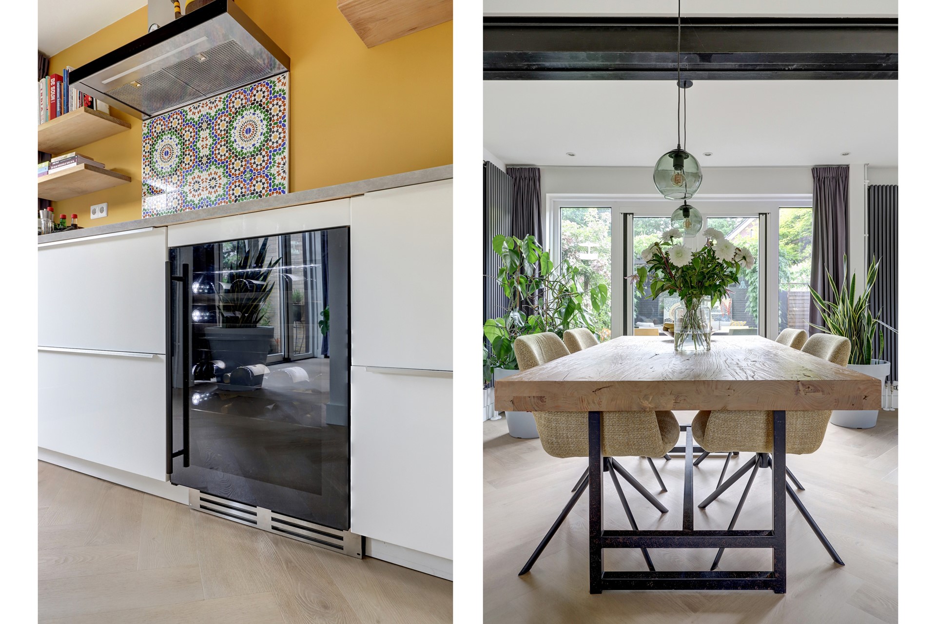 De woonkamer is een fijne lichte ruimte met houtkachel en openslaande deuren naar de tuin. Dankzij de uitbouw over de volledige achterzijde beschik je over een extra ruime leefruimte. Aan de achterzijde is de moderne open keuken (sinds 2019) gesitueerd, uitgerust met inbouwapparatuur zoals koel-/vriescombinatie, stoomoven, magnetron, inductiekookplaat, afzuigkap, wijnkoelkast met 2 zones en vaatwasser.