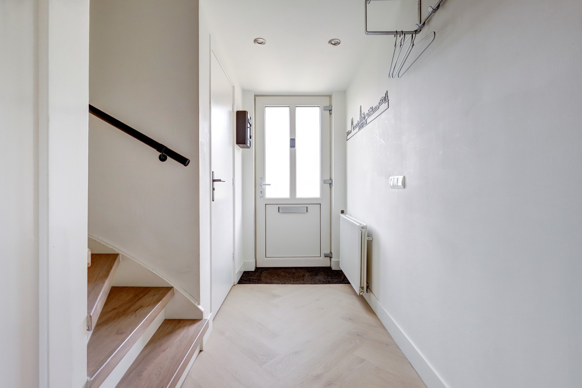 Bij binnenkomst vind je in de hal een garderobe, trapopgang en het toilet.