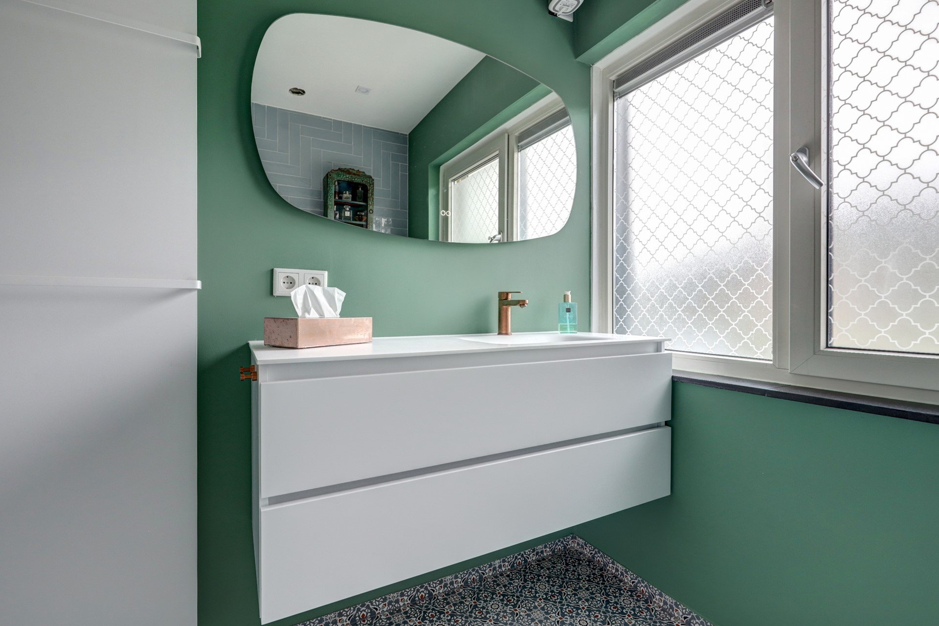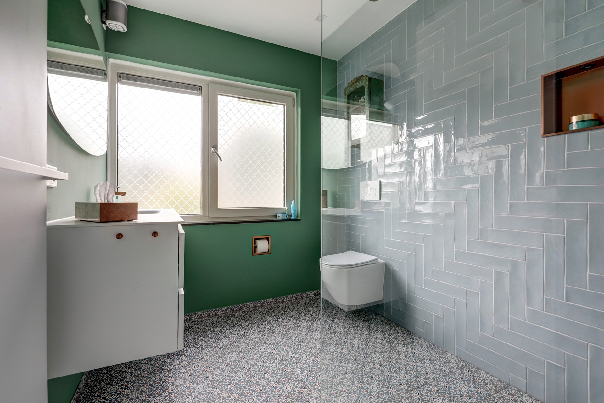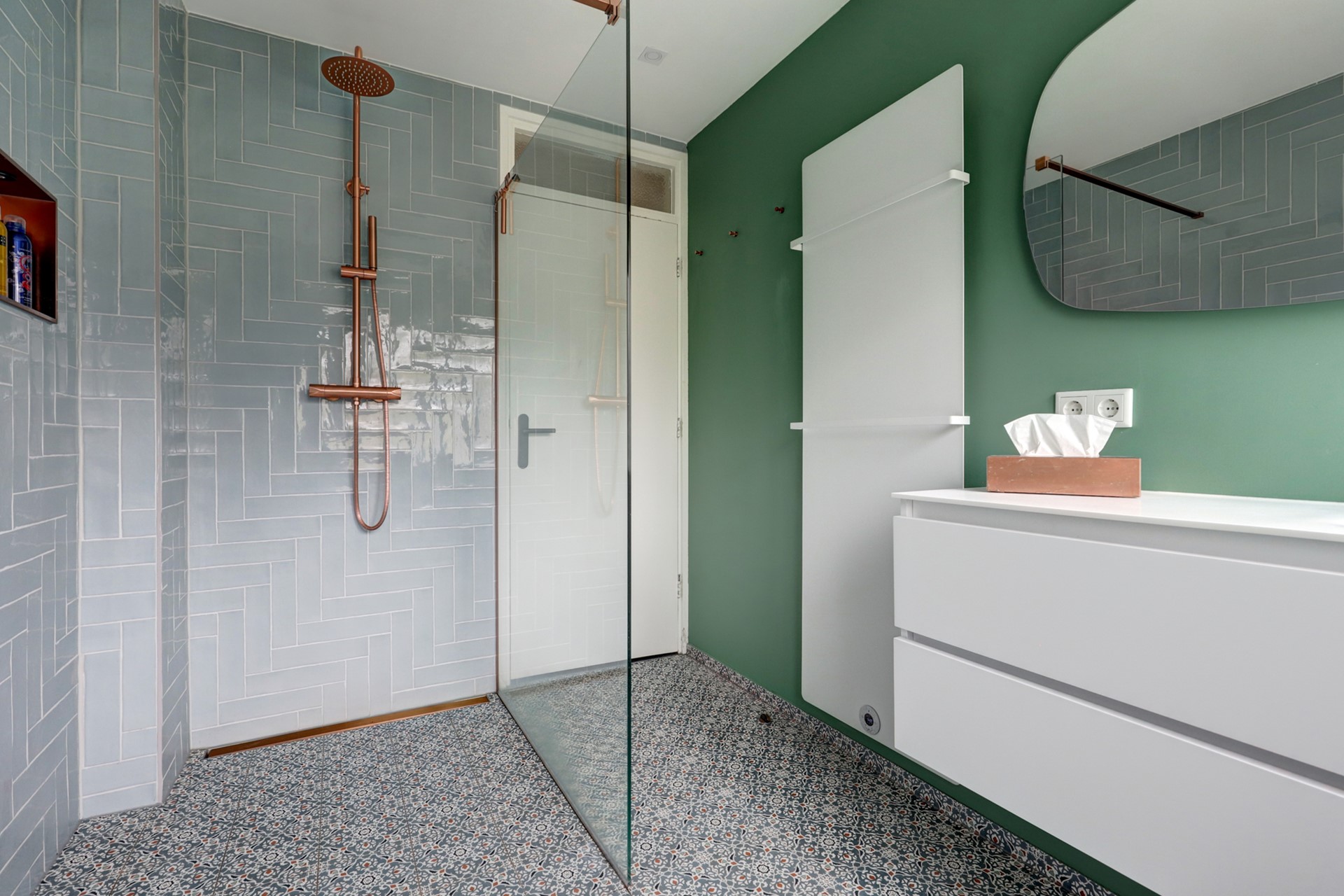 De nieuwe badkamer (2024) is gerealiseerd op de plek van een voormalige slaapkamer en voorzien van inloopdouche, wastafelmeubel en tweede toilet. De ruimte is uitgerust met elektrische paneelverwarming, een verwarmde spiegel, mechanische ventilatie en een handige inbouwnis. Daarmee is dit één van de weinige woningen in dit type met een volwaardige, moderne badkamer.