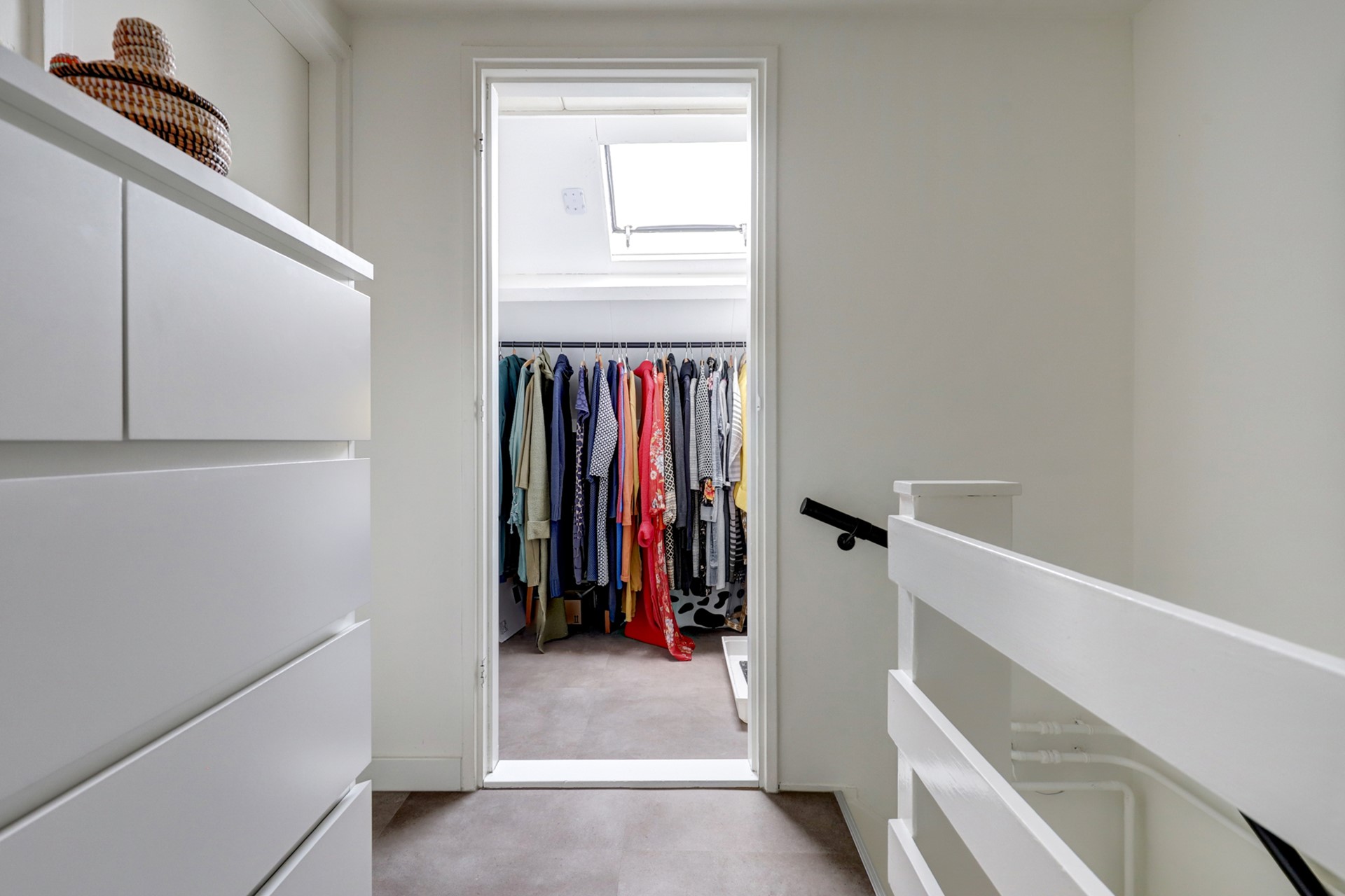 De ruimte van de oude badkamer is omgevormd tot een royale inloopkast, compleet met vloerverwarming.