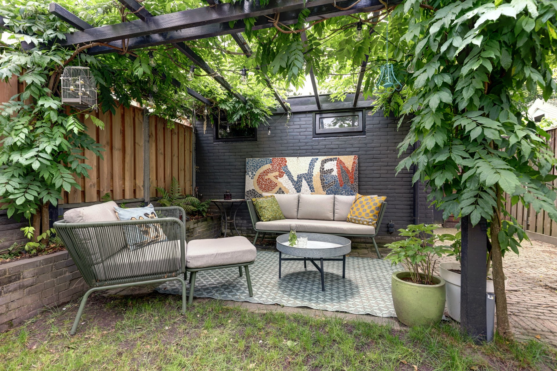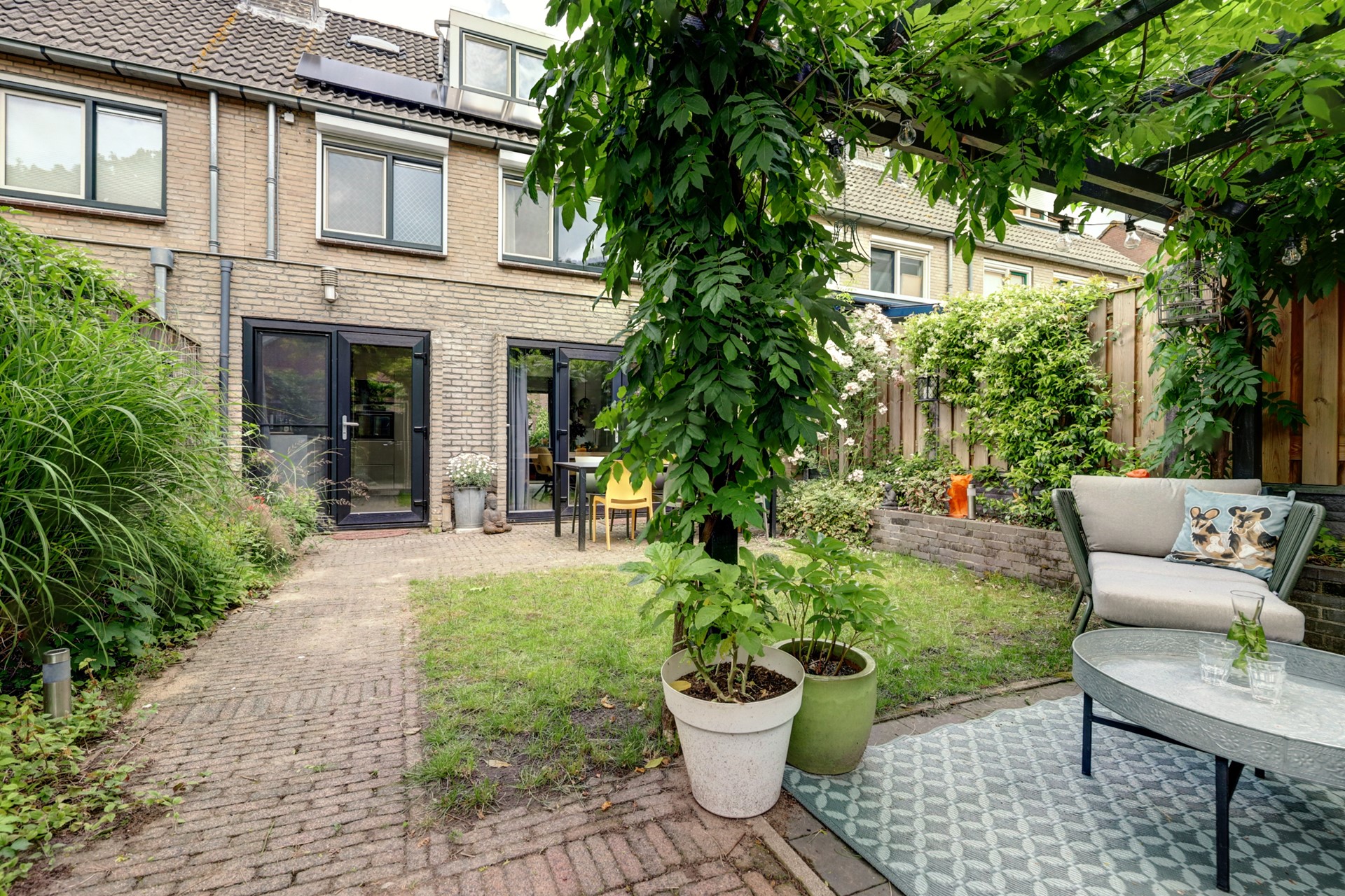 De achtertuin, op het zuidoosten gelegen, heeft een oppervlakte van ca. 60 m². De tuin is zonnig en onderhoudsvriendelijk, met achterom en een vrijstaande stenen berging voorzien van elektra. Achterin biedt een met blauwe regen begroeide pergola een heerlijk beschut zitplekje. Voor de woning is een verzorgde voortuin en voldoende parkeergelegenheid in de straat aanwezig.