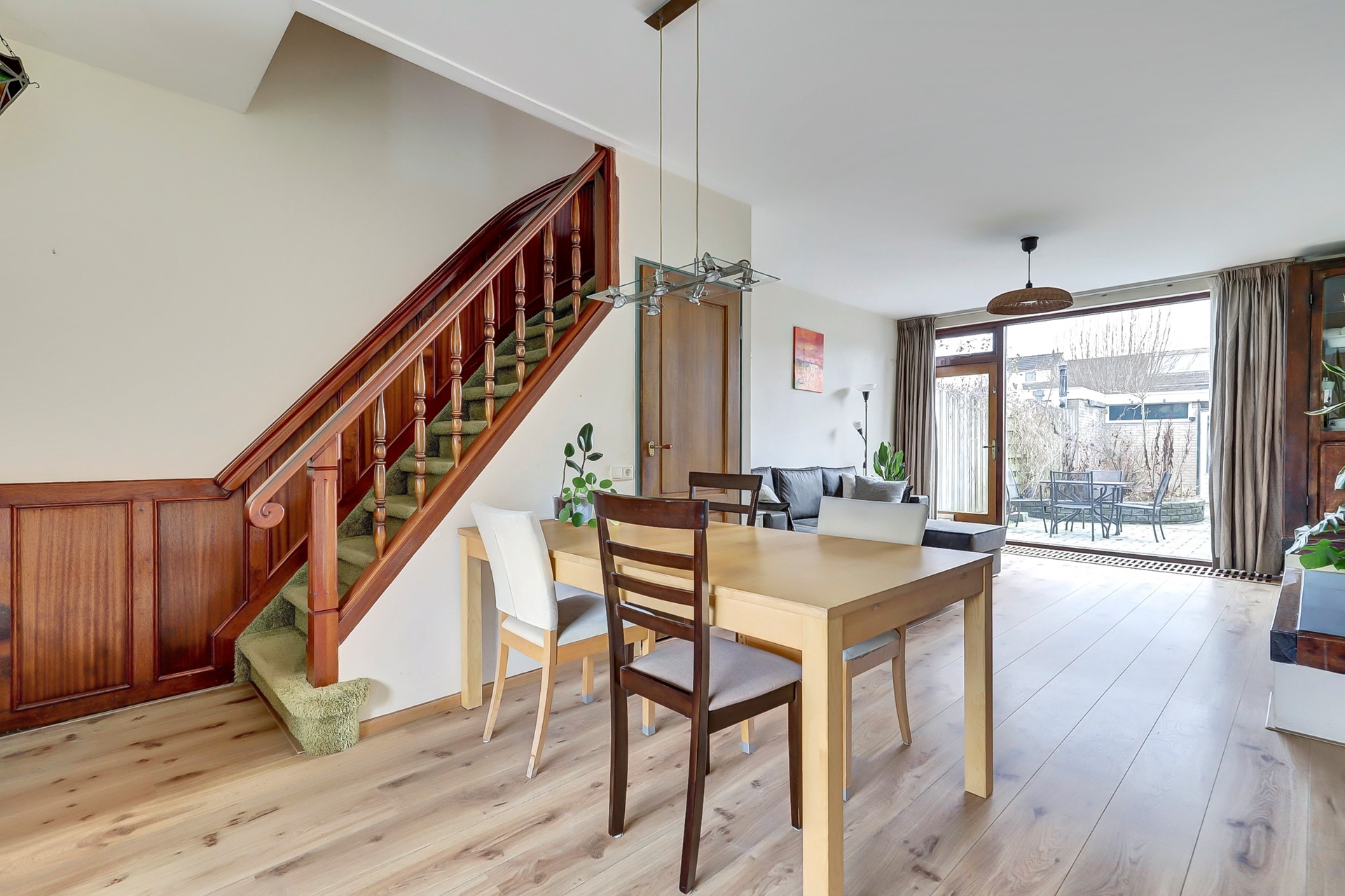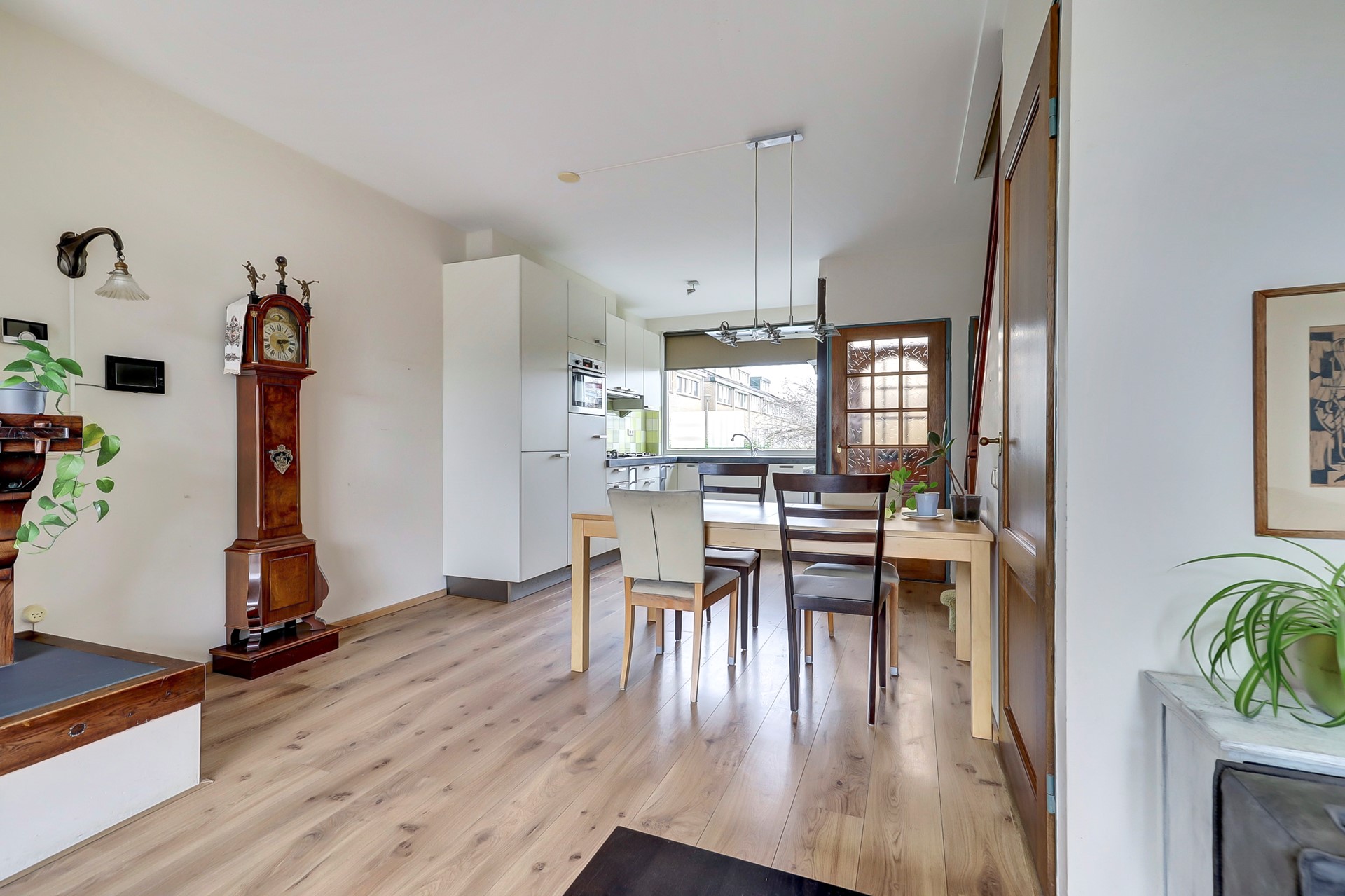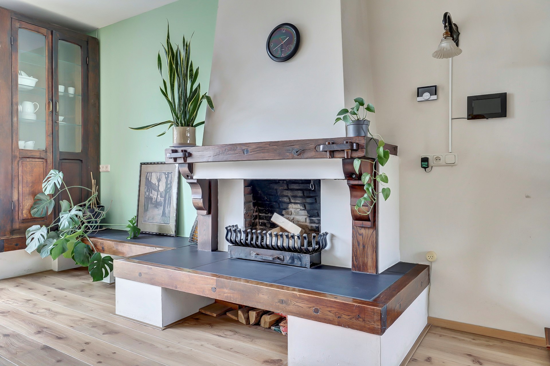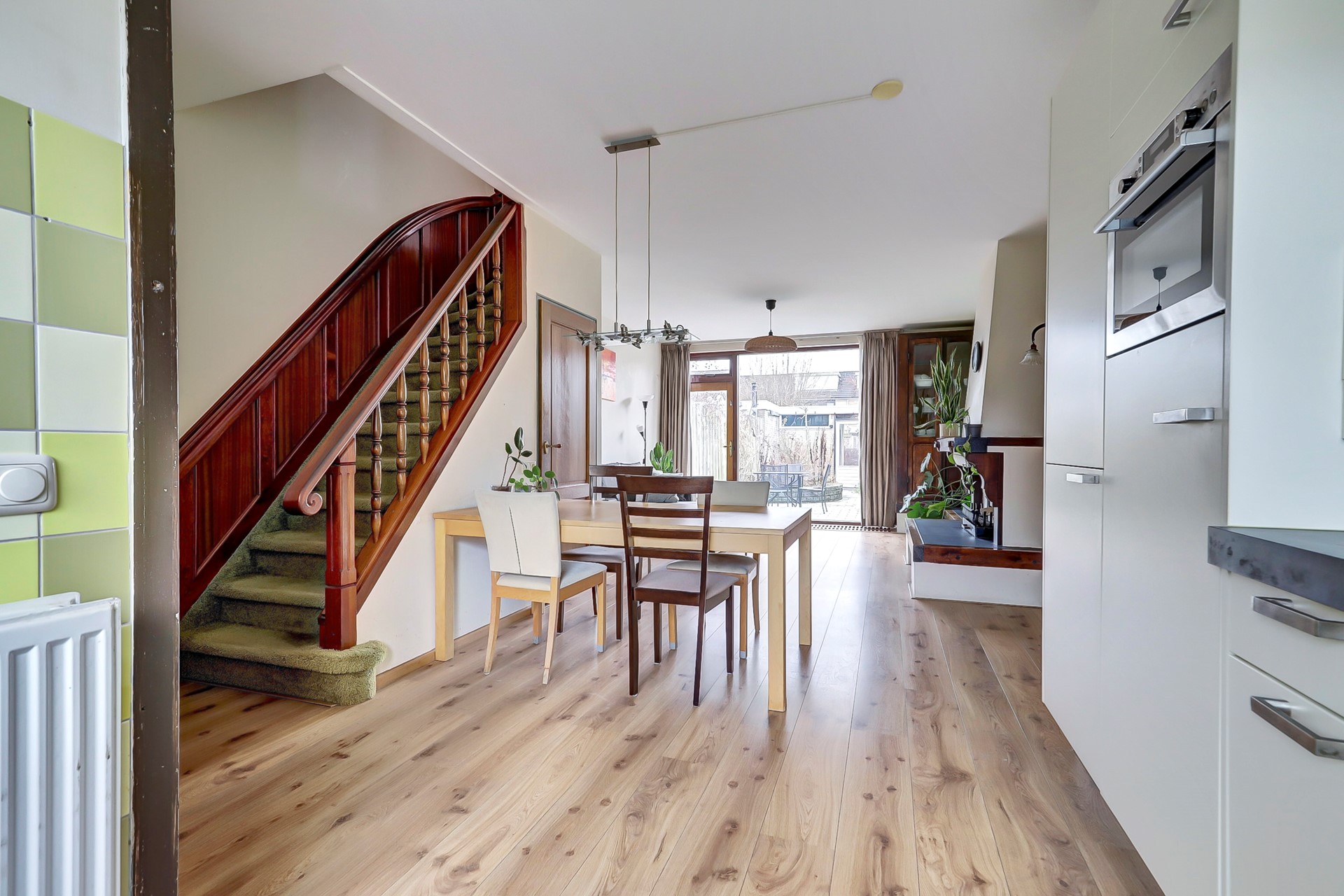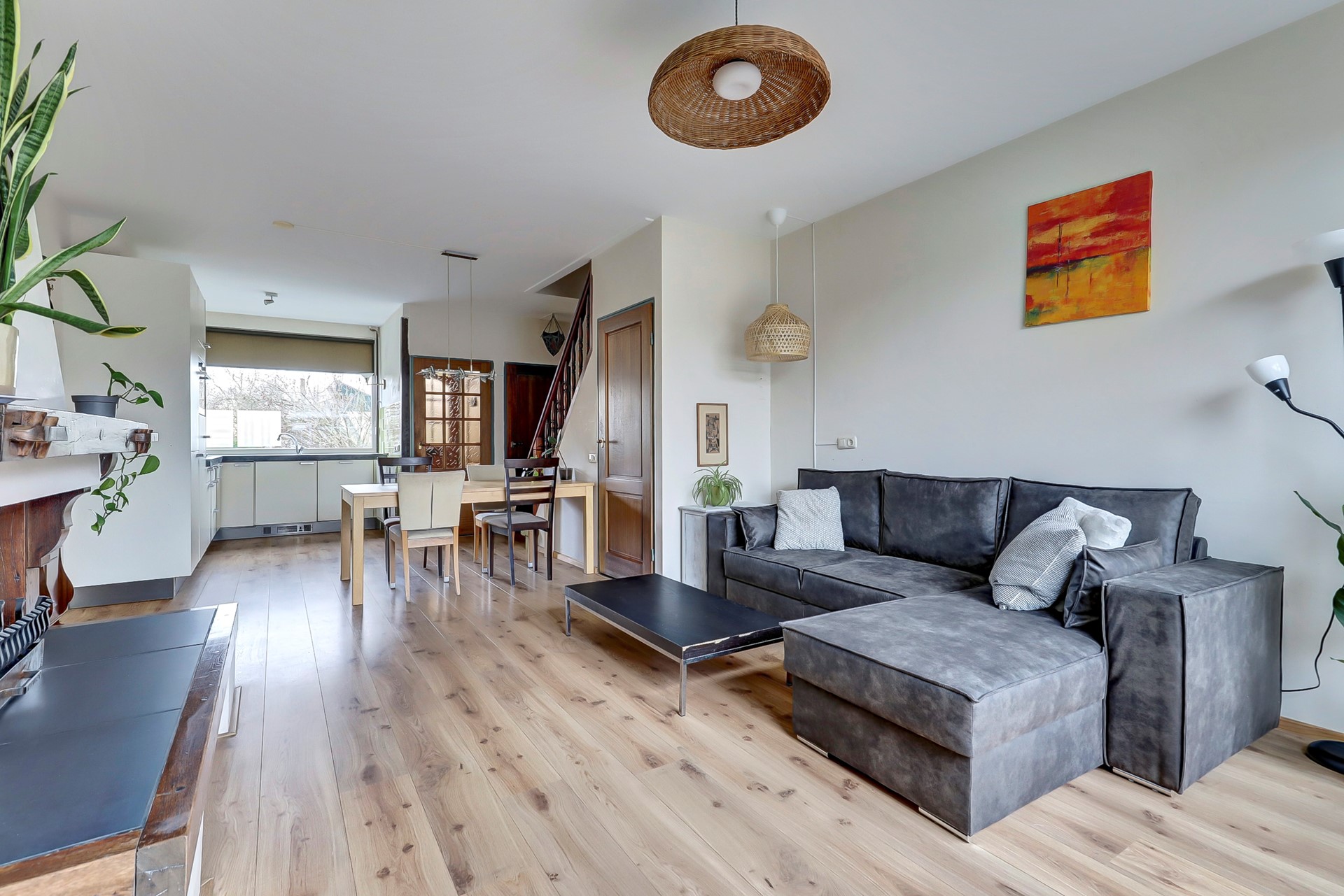 De keuken is voorzien van inbouwapparatuur en biedt een vrij uitzicht op een groen veld met speeltuin. De ruime woonkamer aan de achterzijde heeft grote ramen, een open haard en een directe doorgang naar de tuin, waardoor er veel natuurlijk licht binnenkomt en er een prettige verbinding ontstaat tussen binnen en buiten. Via een vaste trap in de woonkamer bereik je de eerste verdieping.