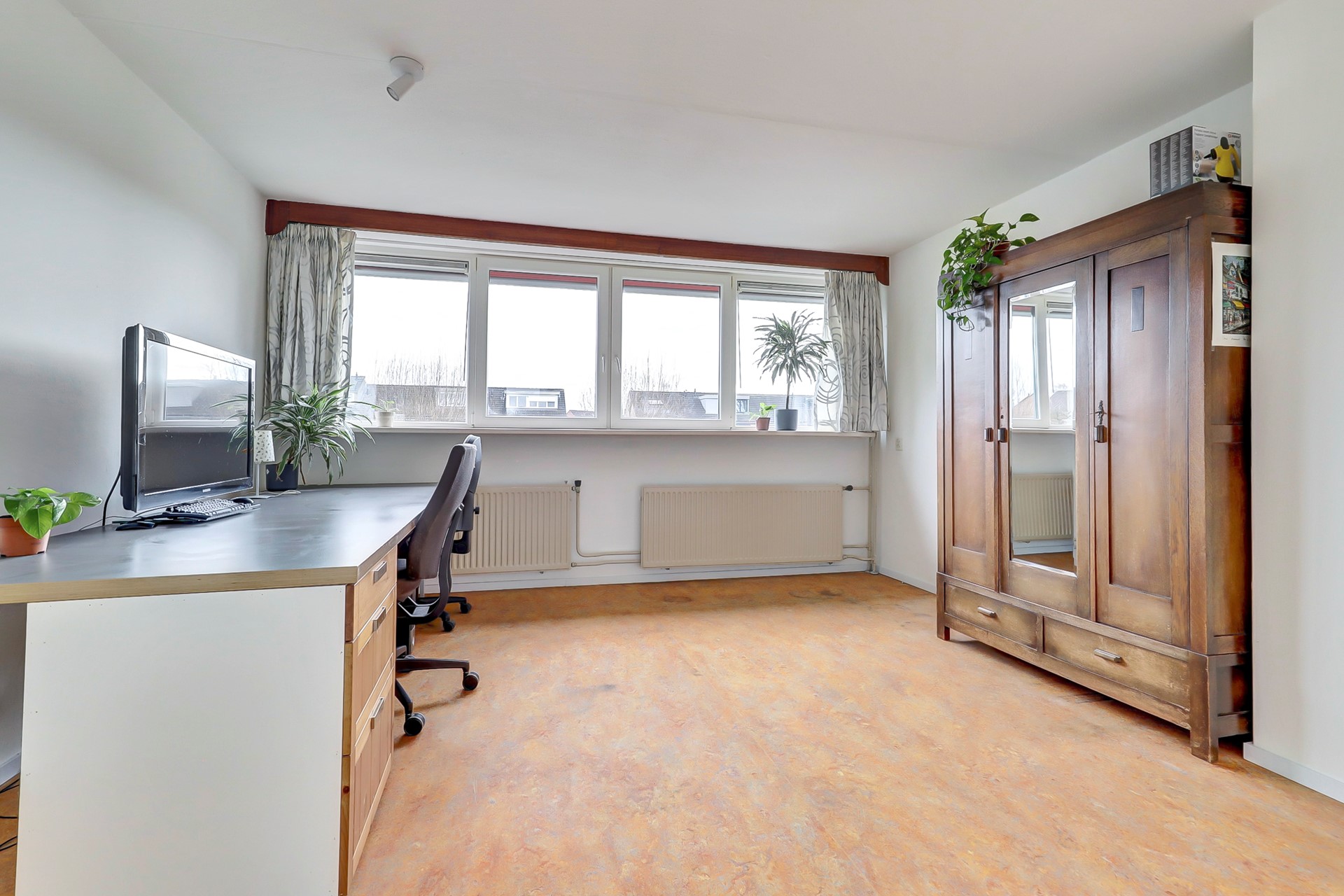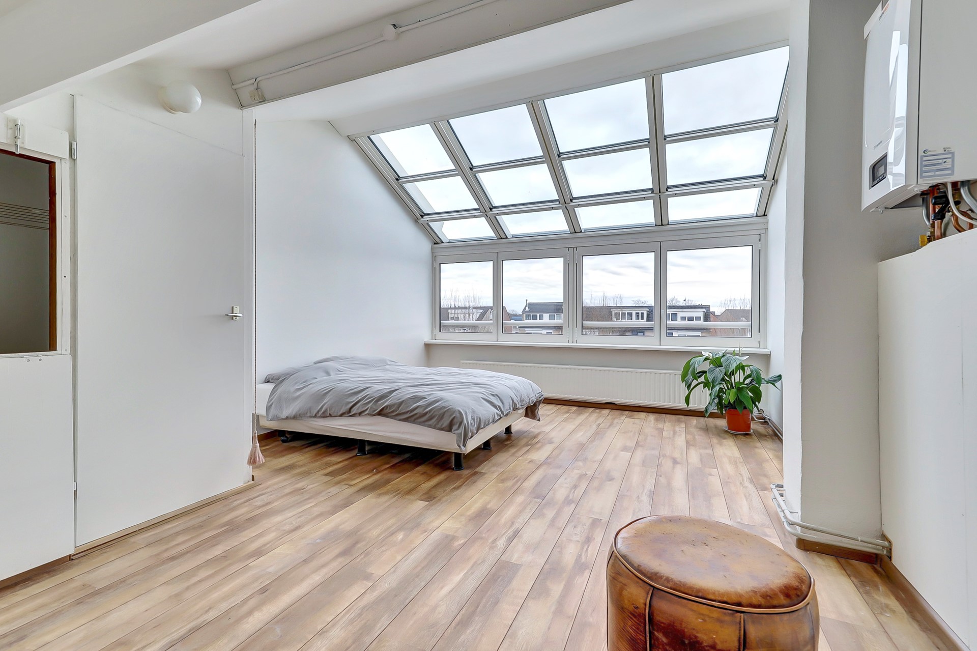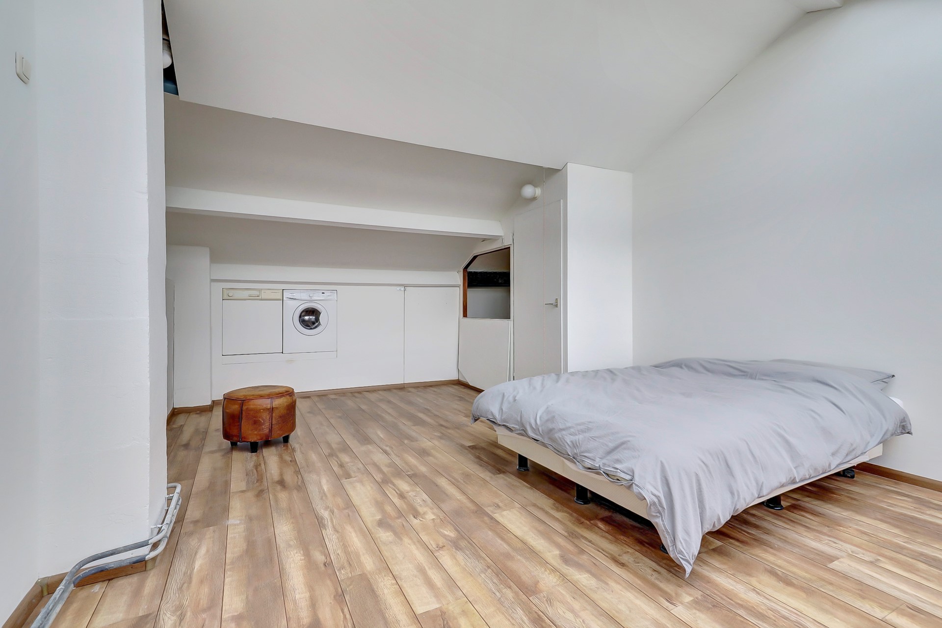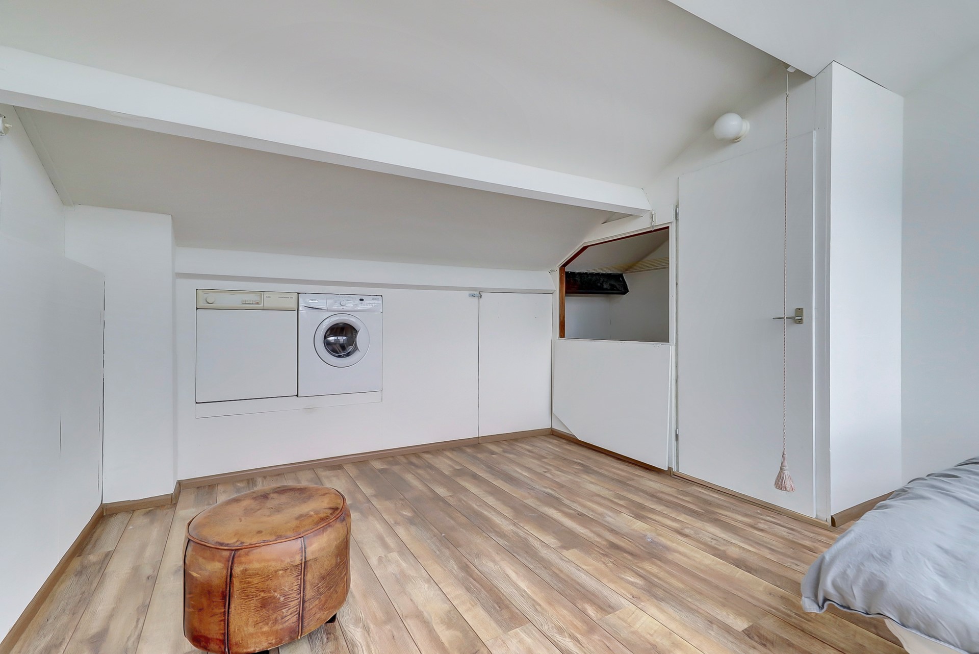Op de tweede verdieping bevindt zich een extra slaapkamer, samen met de cv-installatie en witgoedaansluitingen. De dakserre zorgt voor veel daglicht en een ruimtelijk gevoel. Achter de knieschotten is volop praktische bergruimte aanwezig.