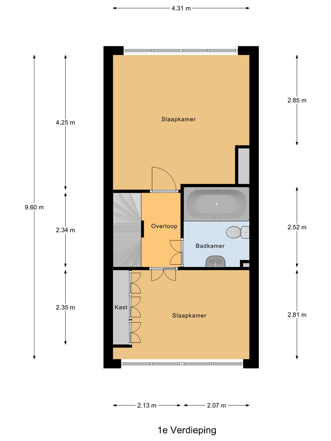 De overloop geeft toegang tot twee slaapkamers en de badkamer, welke is uitgerust met een ligbad, toilet en wastafel.